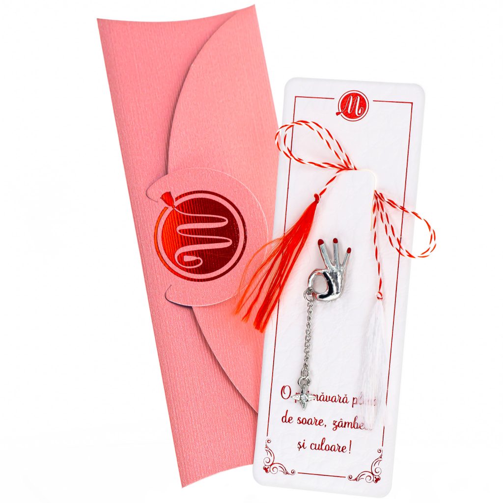 - Broșă Mărțișor Luna Mână cu Steluță Argintie, șnur Marțișor alb-roșu, însoțită de suport pentru broșă, plic roz, pregătită cu grijă pentru a fi oferită ca un cadou special, simbol al tradiției.