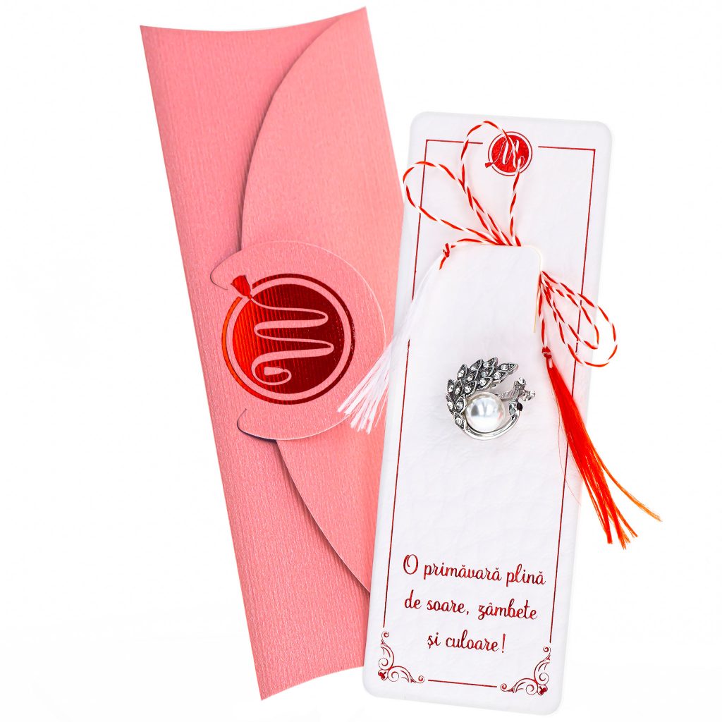 - Broșă Mărțișor Luna Păun Argintiu cu Perluță, șnur Marțișor alb-roșu, însoțită de suport pentru broșă, plic roz, pregătită cu grijă pentru a fi oferită ca un cadou special, simbol al tradiției.