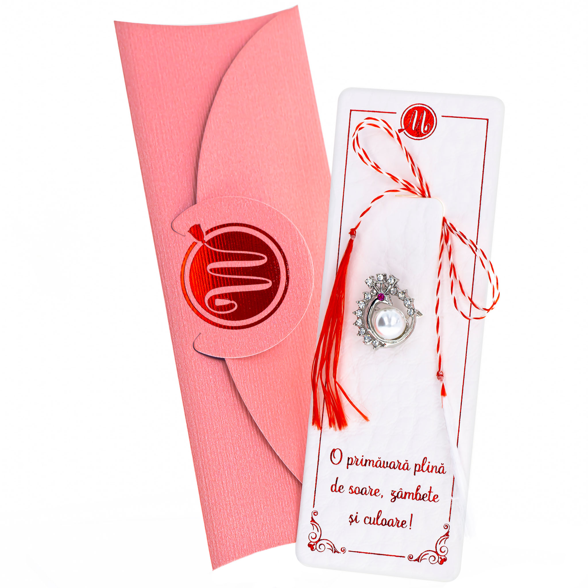 - Broșă Mărțișor Luna Păun Argintiu, șnur Marțișor alb-roșu, însoțită de suport pentru broșă, plic roz, pregătită cu grijă pentru a fi oferită ca un cadou special, simbol al tradiției.