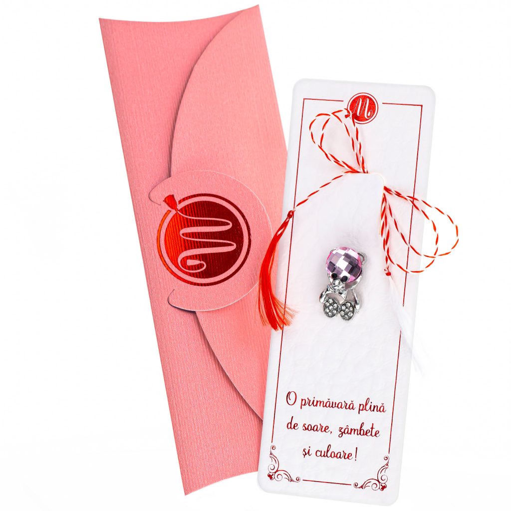 - Broșă Mărțișor Luna Ursuleț Argintiu cu Piatră Roz, șnur Marțișor alb-roșu, însoțită de suport pentru broșă, plic roz, pregătită cu grijă pentru a fi oferită ca un cadou special, simbol al tradiției.