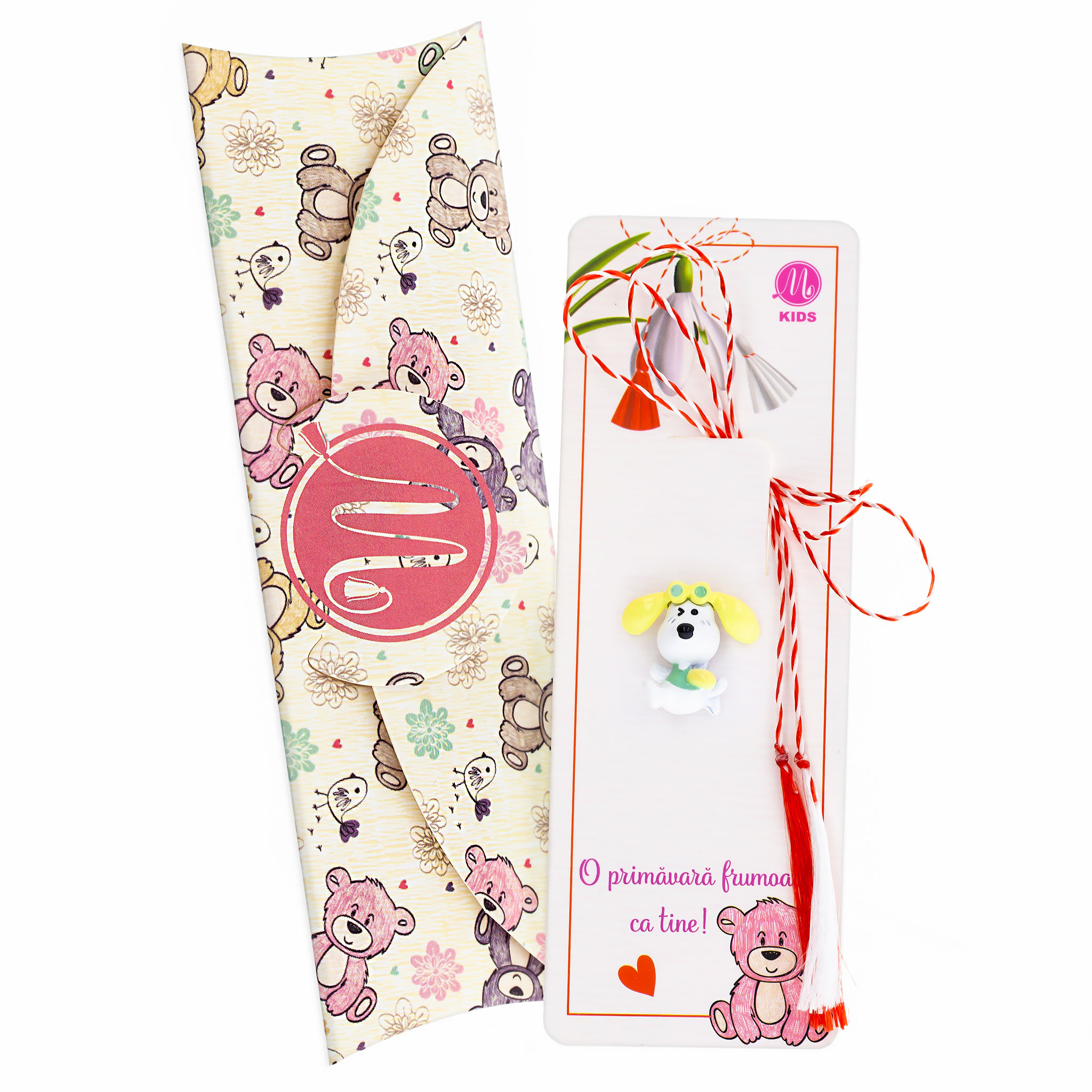 - Broșă Pin Mărțișor – Cățel Aviator cu Palărie Galbenă, șnur Marțișor alb-roșu, însoțită de suport pentru broșă și plic, pregătită să adauge un zâmbet fiecărei zile.