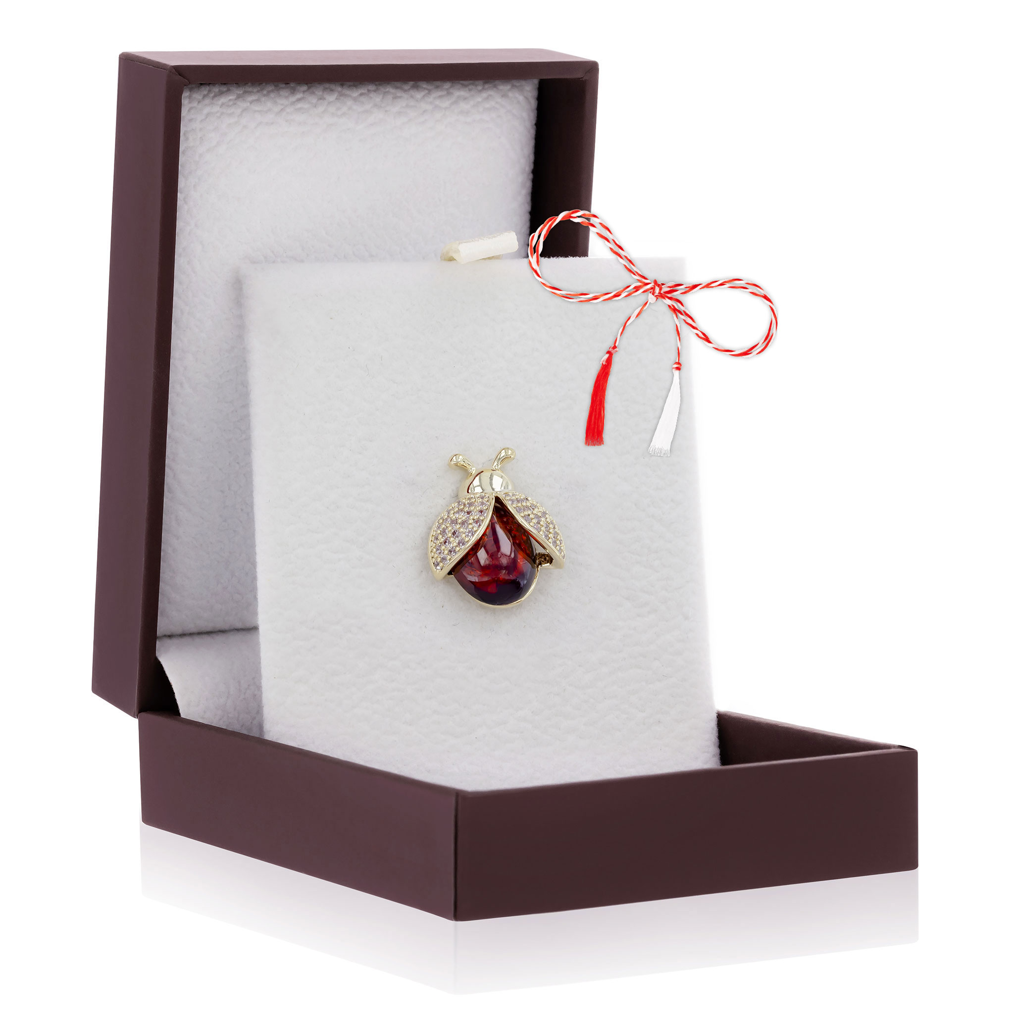 - Broșă Pin Premium Gold Plated Buburuză cu Piatră Roșie, șnur Marțișor alb-roșu, ambalată pe suport pentru broșă și casetă, însoțită de pungă cadou și plic verde pentru mesaj, pregătită cu grijă astfel încât să devină un cadou memorabil.