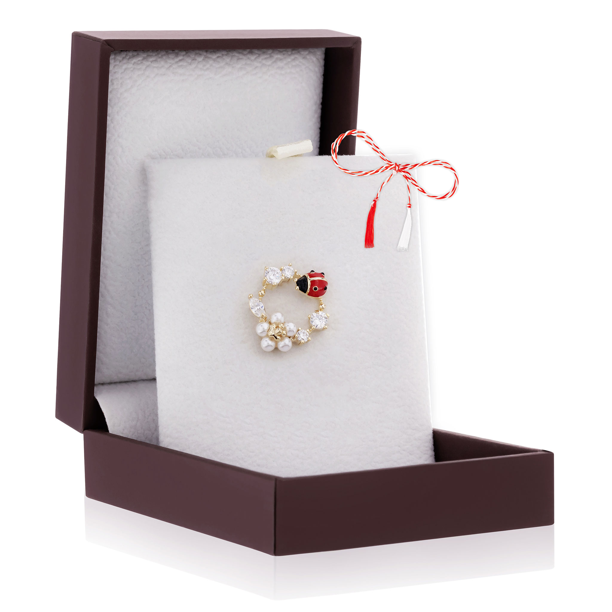 - Broșă Pin Premium Gold Plated Coroniță de Primăvară, șnur Marțișor alb-roșu, ambalată pe suport pentru broșă și casetă, însoțită de pungă cadou și plic verde pentru mesaj, pregătită cu grijă astfel încât să devină un cadou memorabil.