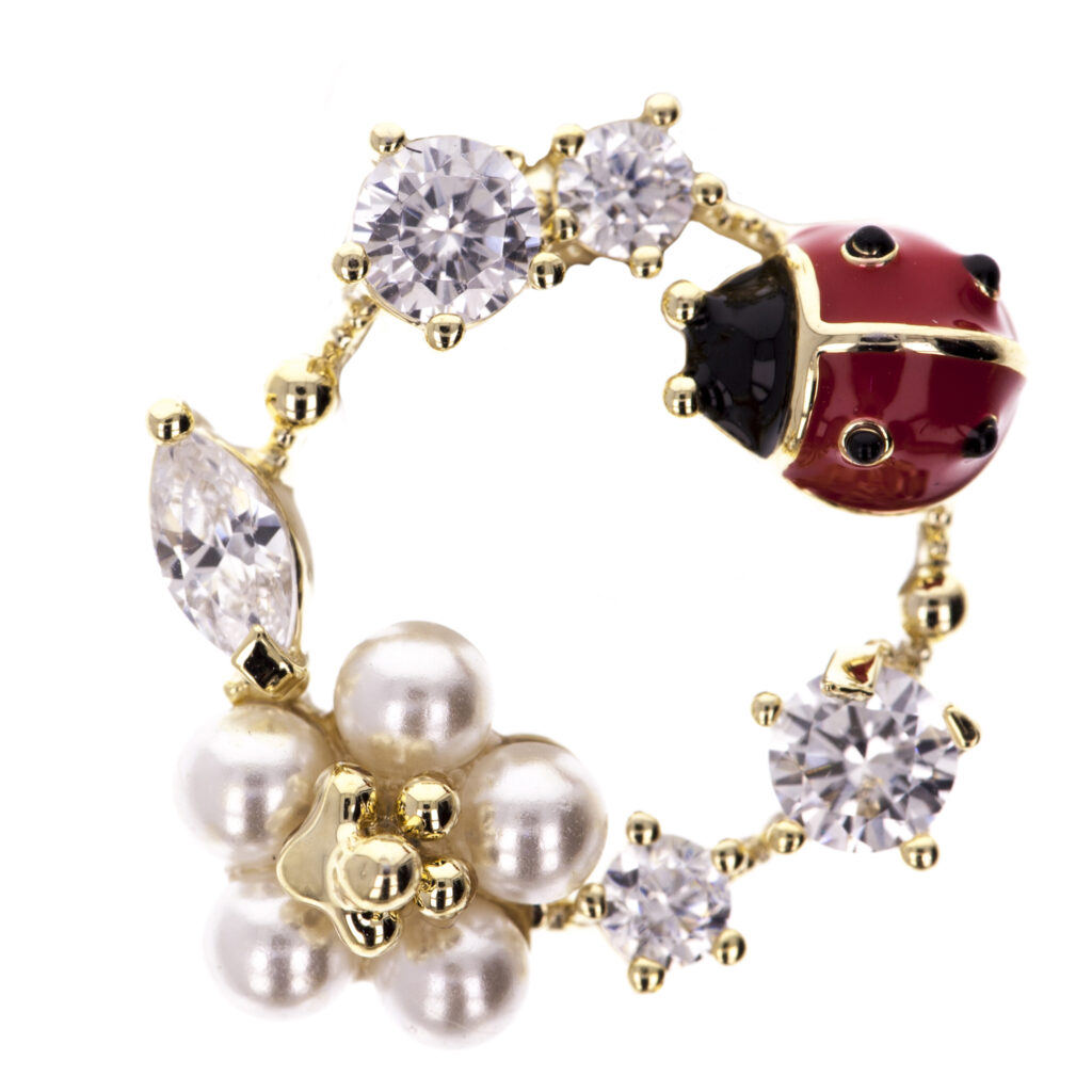 Această broșă în formă de coroniță de primăvară pare să fie o mică comoară a naturii, capturând farmecul și frumusețea sezonului de primăvară. Detaliile delicate ale coroniței, însoțite de cristale strălucitoare, adaugă un element de eleganță și rafinament, sugerând că primăvara este un moment al rennoirii și al prospețimii.