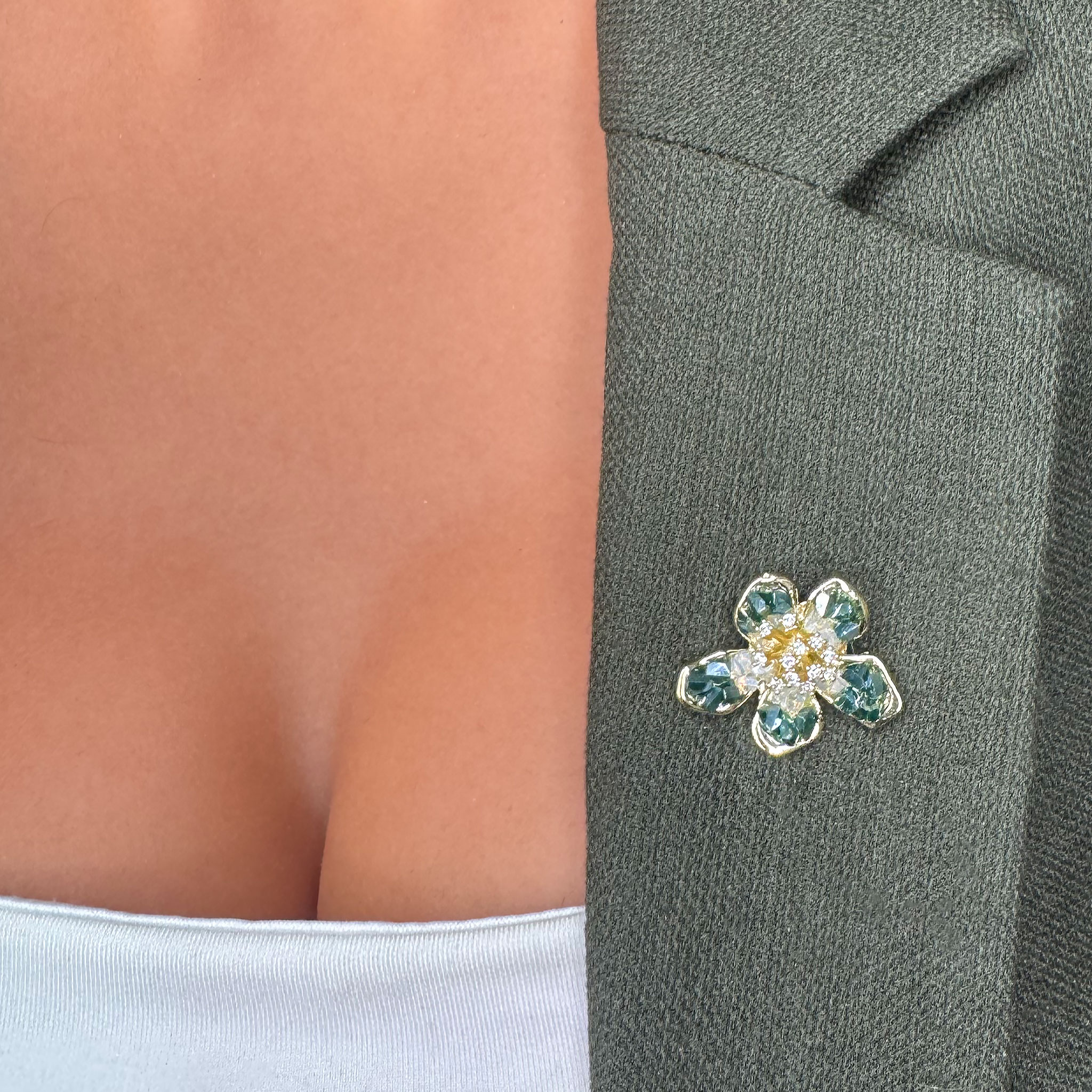 Această broșă în formă de floare stilizată verde aduce un aer proaspăt și natural. Cu petale delicate și o nuanță de verde vibrant, simbolizează armonia și echilibrul, fiind o alegere perfectă pentru a adăuga un accent subtil de culoare oricărei ținute.