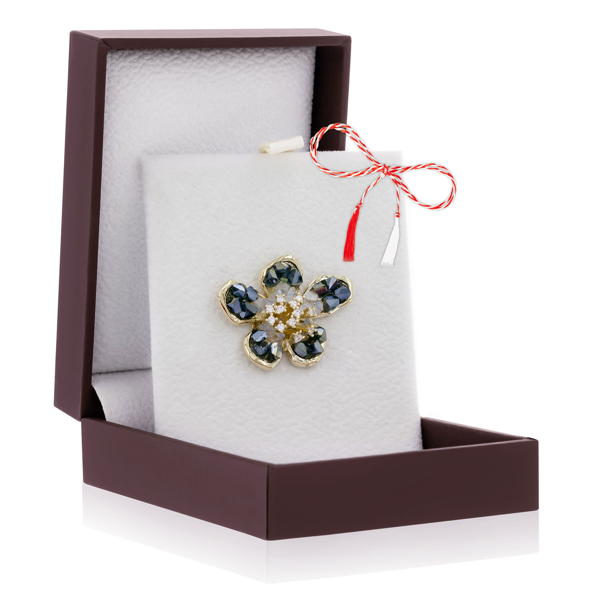 - Broșă Pin Premium Gold Plated Floare Stilizată Verde Hand-Made, șnur Marțișor alb-roșu, ambalată pe suport pentru broșă și casetă, însoțită de pungă cadou și plic verde pentru mesaj, pregătită cu grijă astfel încât să devină un cadou memorabil.