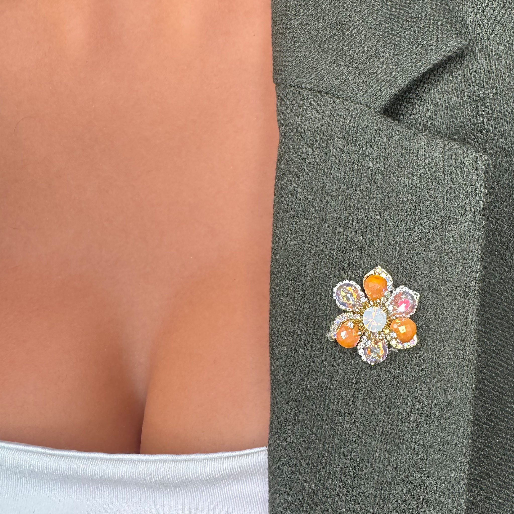 Broșa în formă de floricică cu pietricele portocalii este un accesoriu vibrant și plin de viață, perfect pentru a adăuga un strop de culoare și energie oricărei ținute.