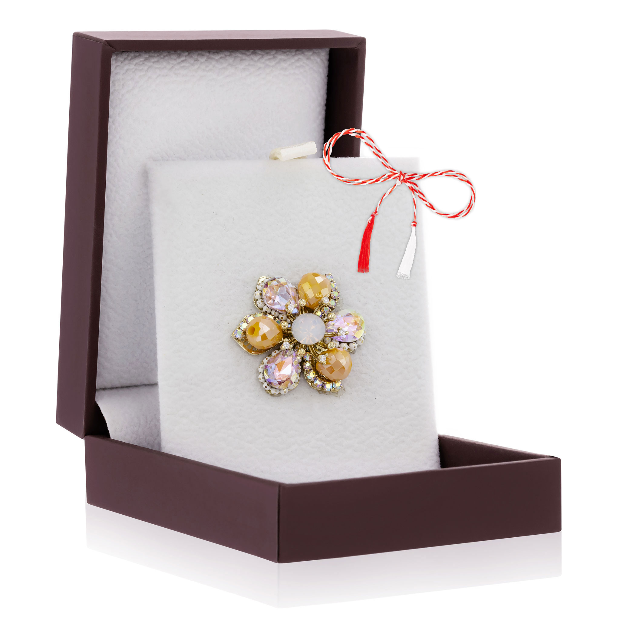 - Broșă Pin Premium Gold Plated Floricică cu Pietricele Portocalii Hand-Made, șnur Marțișor alb-roșu, ambalată pe suport pentru broșă și casetă, însoțită de pungă cadou și plic roșu cu mesaj, pregătită cu grijă astfel încât să devină un cadou memorabil.