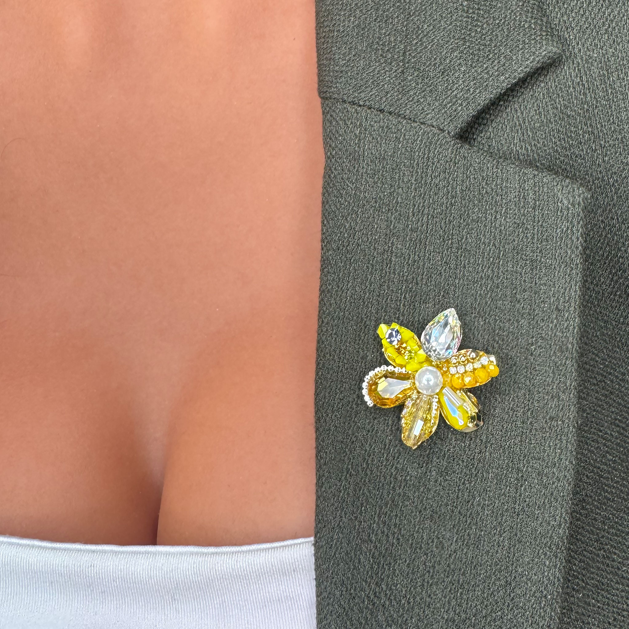 Această broșă în formă de floricică galbenă cu perlă radiază lumină și veselie. Combinația între galbenul vibrant al florii și eleganța perlei adaugă un strop de rafinament și naturalețe, perfectă pentru a aduce un plus de culoare și strălucire ținutelor tale.