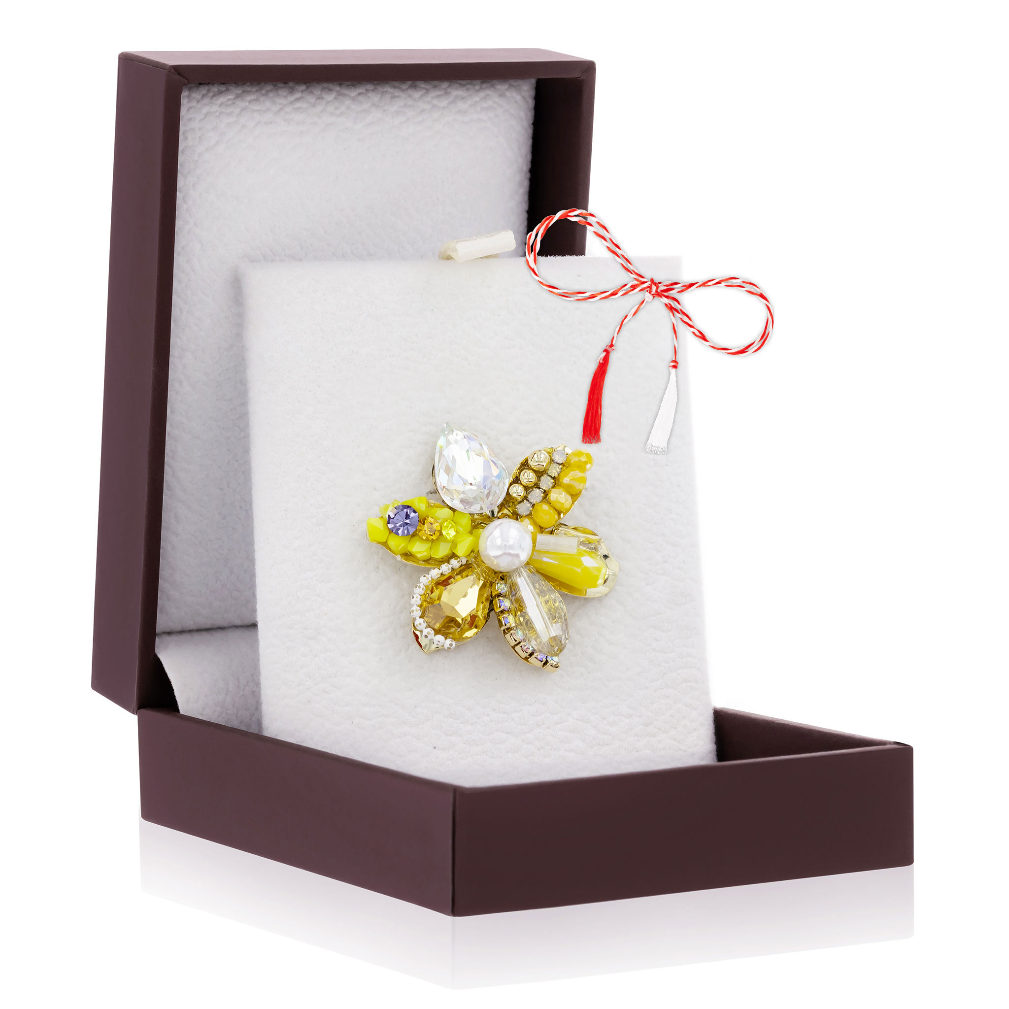- Broșă Pin Premium Gold Plated Floricică Galbenă Cu Perlă Hand-Made, șnur Marțișor alb-roșu, ambalată pe suport pentru broșă și casetă, însoțită de pungă cadou și plic verde pentru mesaj, pregătită cu grijă astfel încât să devină un cadou memorabil.