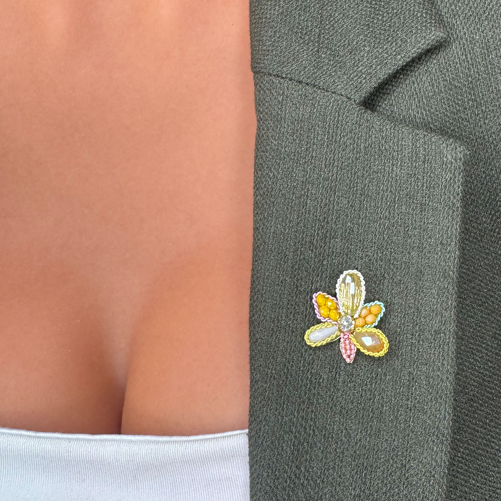 Broșa în formă de floricică stilizată galbenă este un accesoriu vesel și radiant, perfect pentru a adăuga un strop de culoare și energie oricărei ținute.
