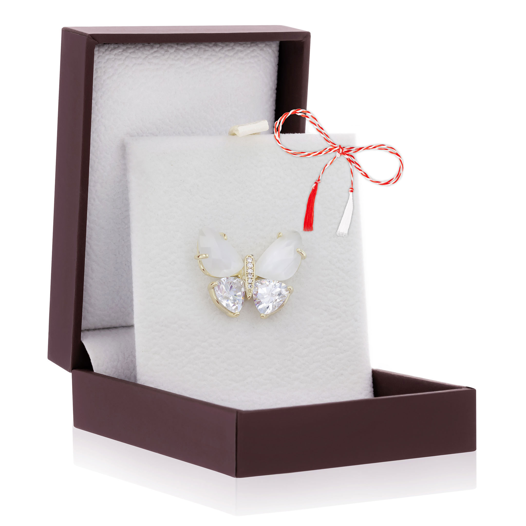 - Broșă Pin Premium Gold Plated Fluturaș cu Aripi Albe, șnur Marțișor alb-roșu, ambalată pe suport pentru broșă și casetă, însoțită de pungă cadou și plic roșu cu mesaj, pregătită cu grijă astfel încât să devină un cadou memorabil.