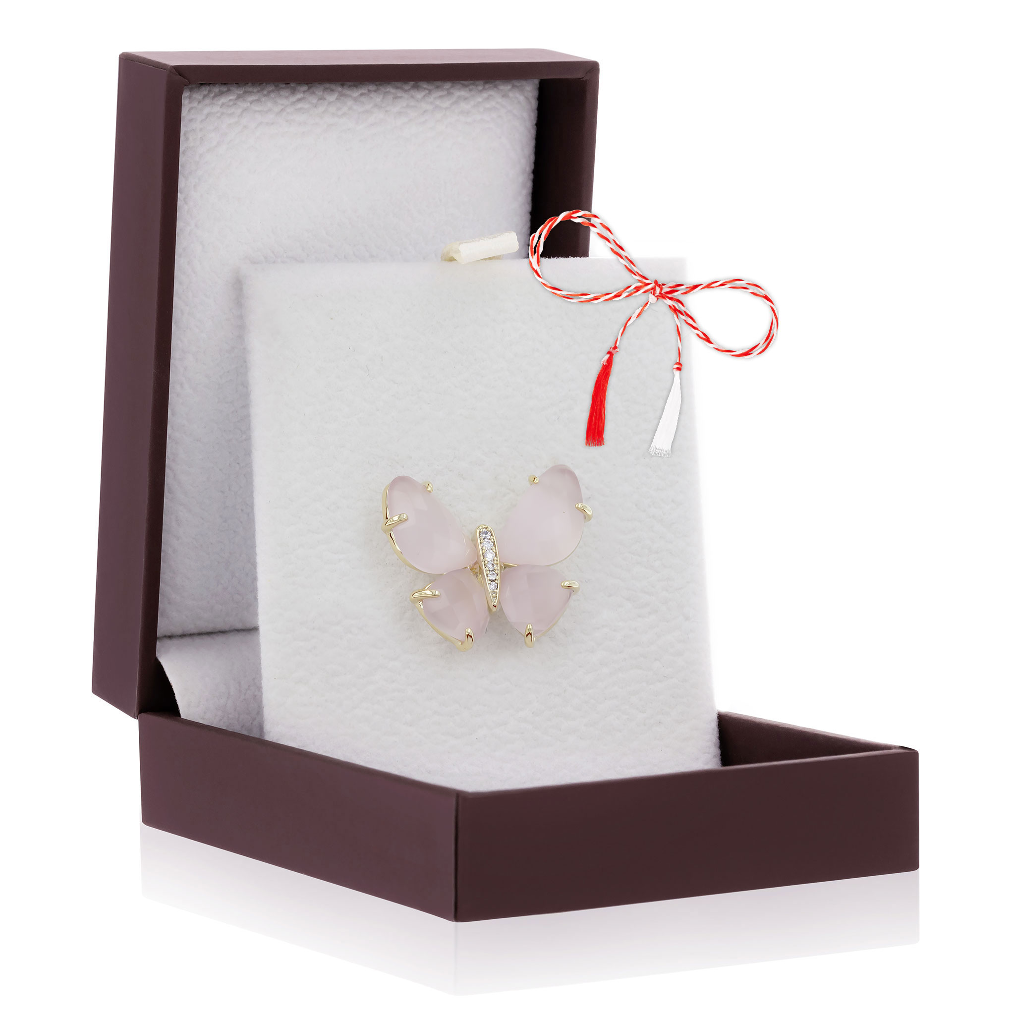 - Broșă Pin Premium Gold Plated Fluturaș cu Aripi Roz, șnur Marțișor alb-roșu, ambalată pe suport pentru broșă și casetă, însoțită de pungă cadou și plic roșu cu mesaj, pregătită cu grijă astfel încât să devină un cadou memorabil.