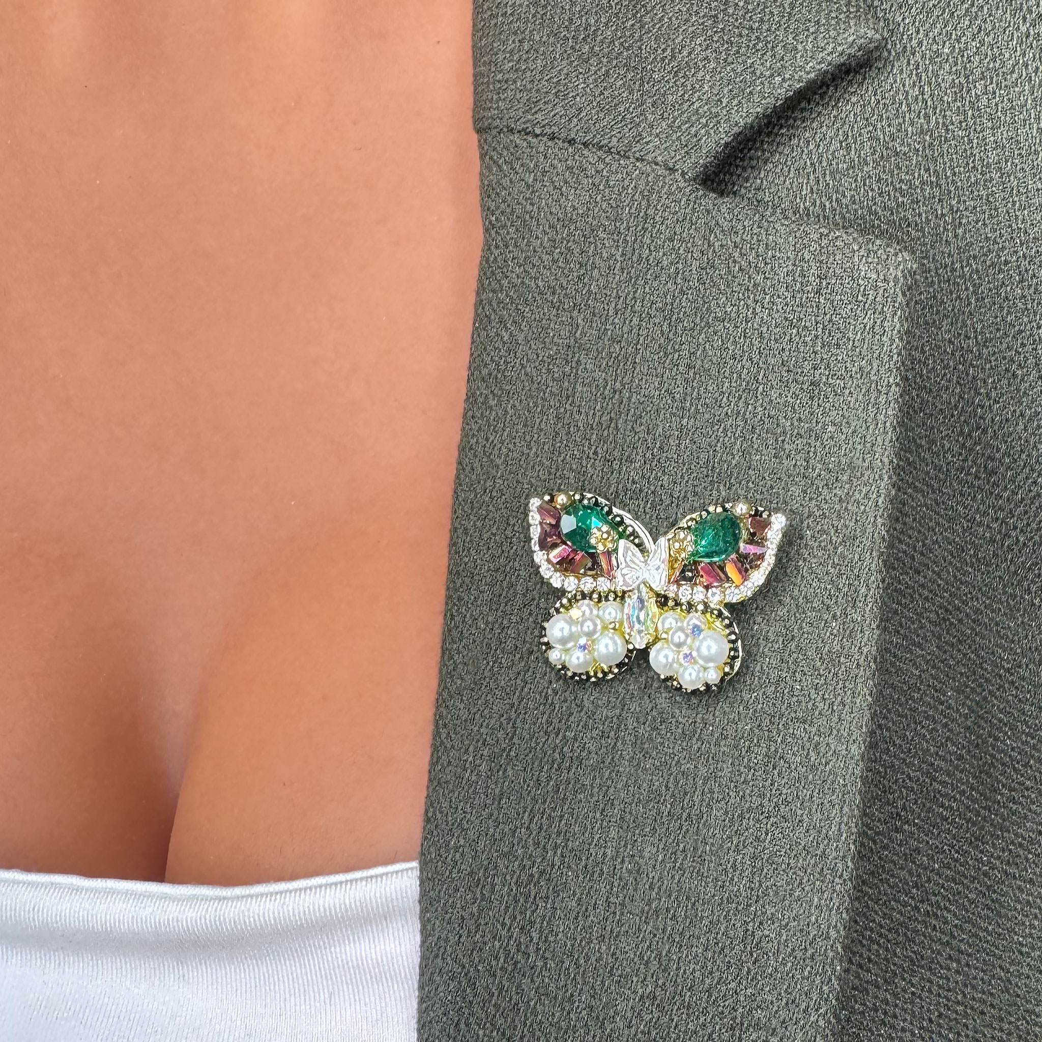 Broșa în formă de fluturaș cu perluțe este un accesoriu delicat și rafinat, care adaugă un aer de eleganță și frumusețe oricărei ținute.