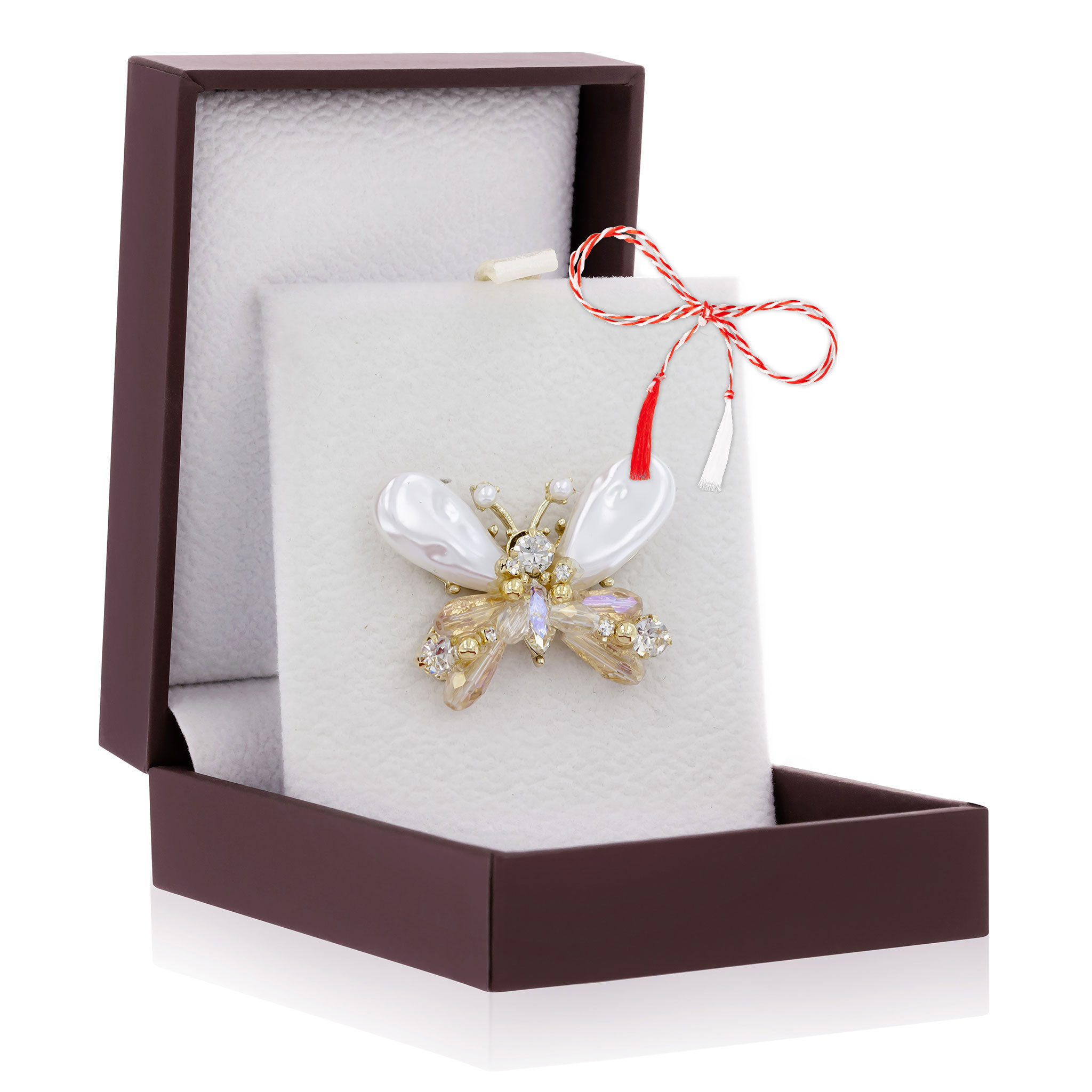 - Broșă Pin Premium Gold Plated Fluture Cu Aripi Roz Hand-Made, șnur Marțișor alb-roșu, ambalată pe suport pentru broșă și casetă, însoțită de pungă cadou și plic verde pentru mesaj, pregătită cu grijă astfel încât să devină un cadou memorabil.