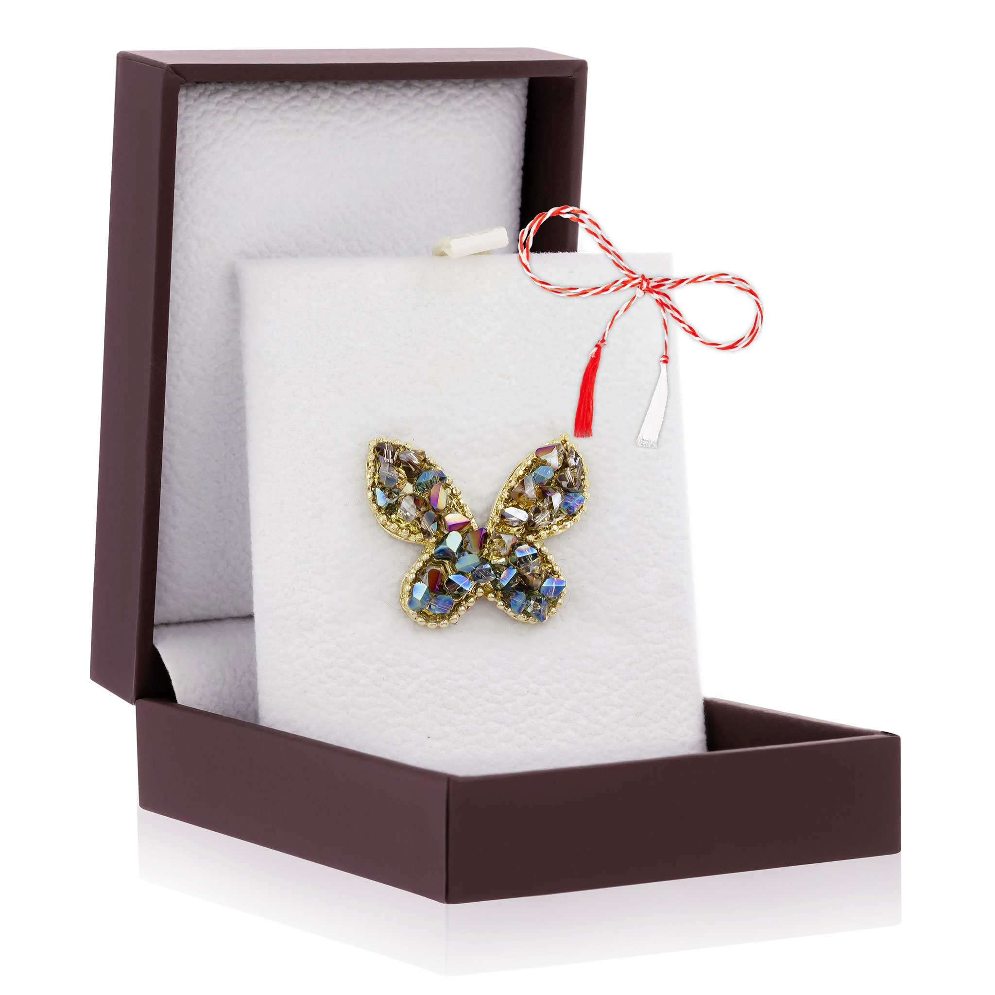 - Broșă Pin Premium Gold Plated Fluture Cu Pietricele Multicolore Hand-Made, șnur Marțișor alb-roșu, ambalată pe suport pentru broșă și casetă, însoțită de pungă cadou și plic verde pentru mesaj, pregătită cu grijă astfel încât să devină un cadou memorabil.