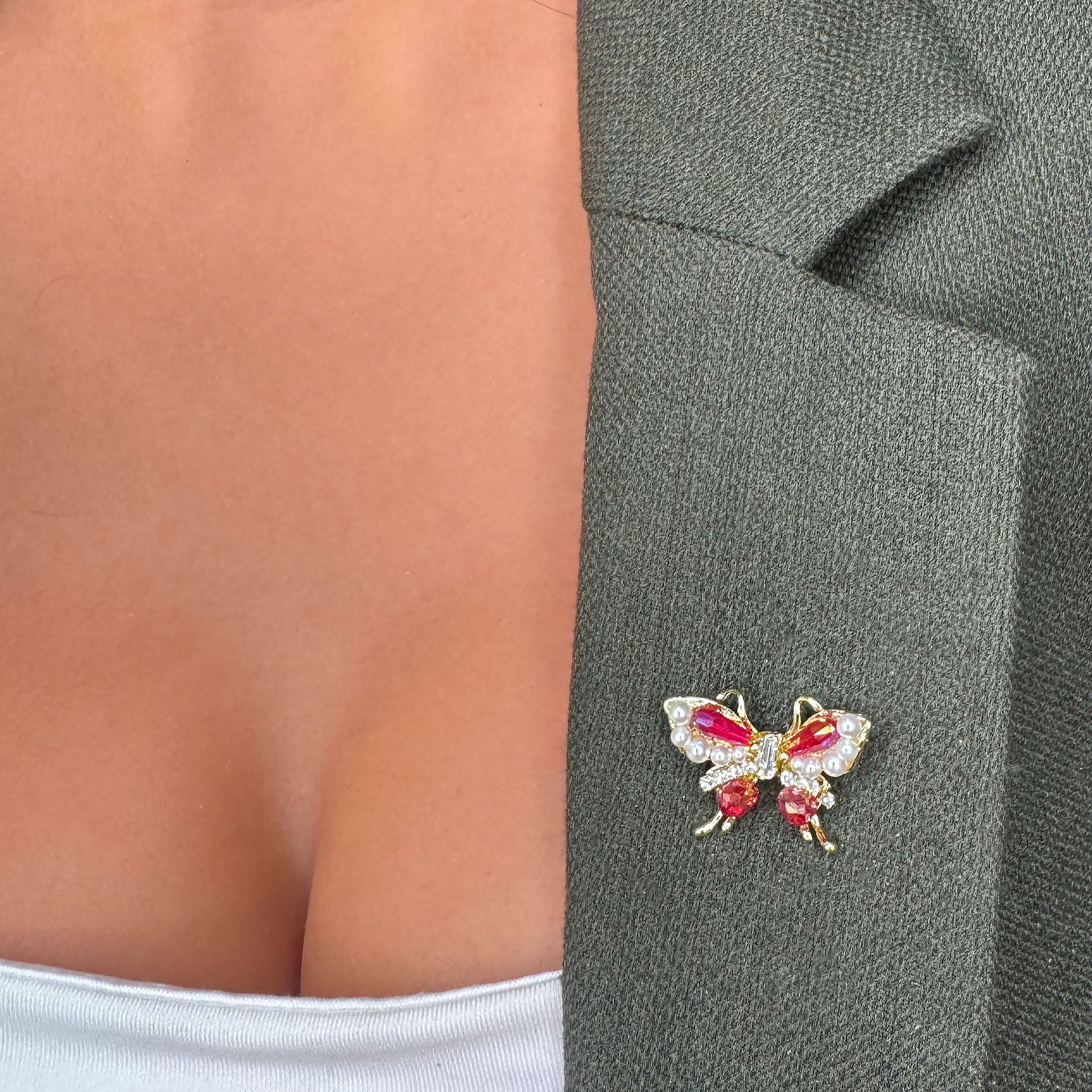Broșă Pin Premium Gold Plated – Fluture Cu Pietricele Roșii Hand-Made