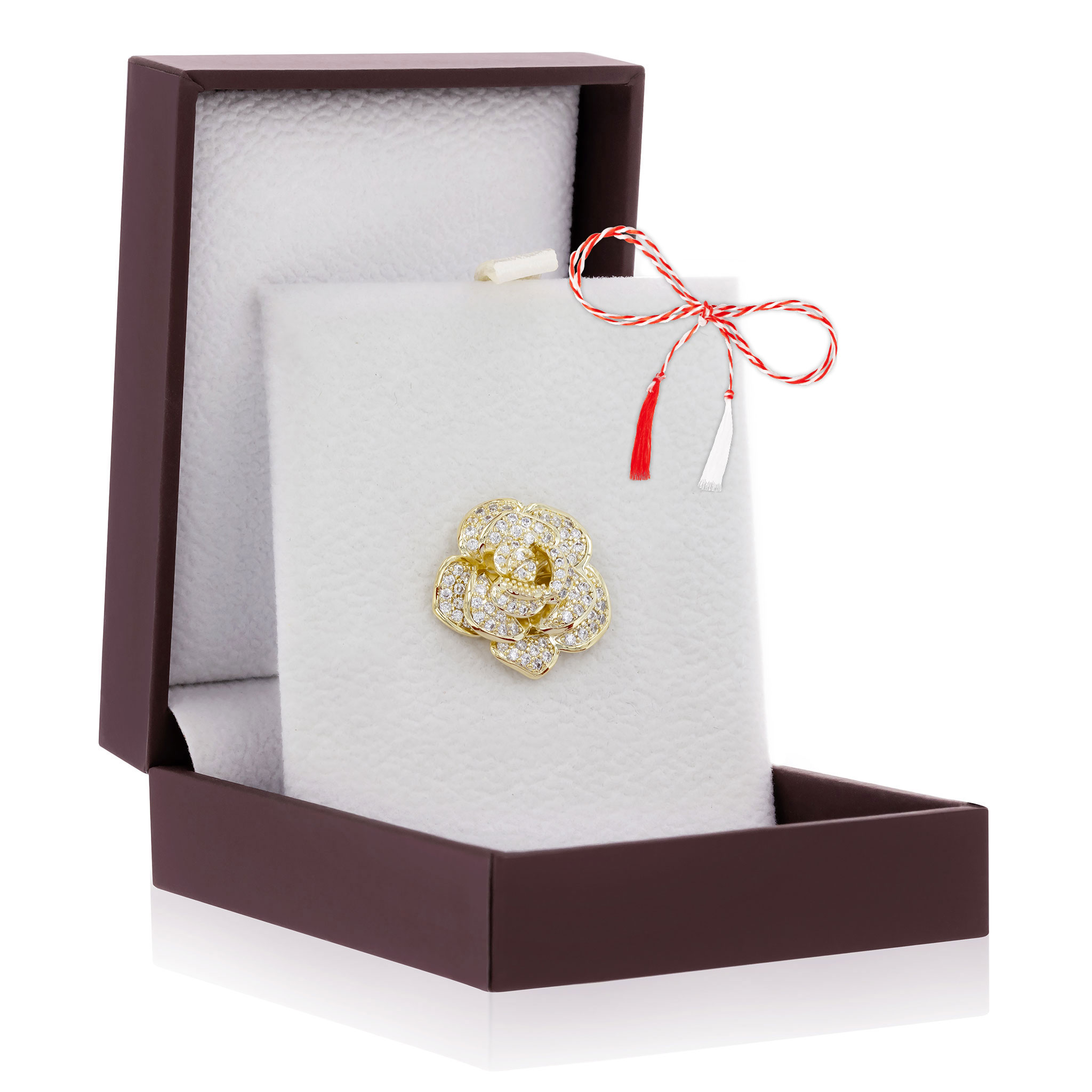 - Broșă Pin Premium Gold Plated Trandafir cu Pietricele, șnur Marțișor alb-roșu, ambalată pe suport pentru broșă și casetă, însoțită de pungă cadou și plic roșu cu mesaj, pregătită cu grijă astfel încât să devină un cadou memorabil.
