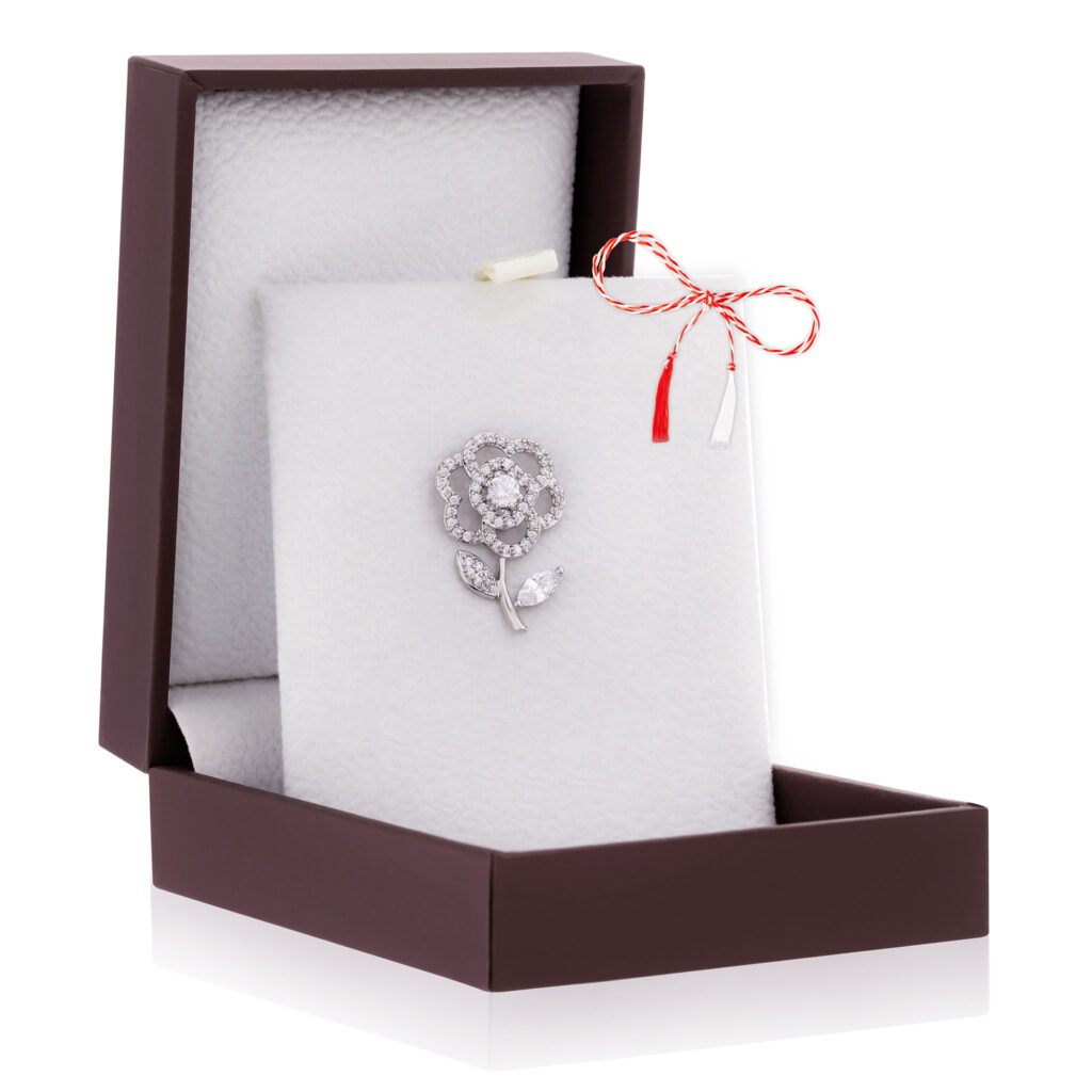 - Broșă Pin Premium Palladium White Trandafir, șnur Marțișor alb-roșu, ambalată pe suport pentru broșă și casetă, însoțită de pungă cadou și plic verde pentru mesaj, pregătită cu grijă astfel încât să devină un cadou memorabil.