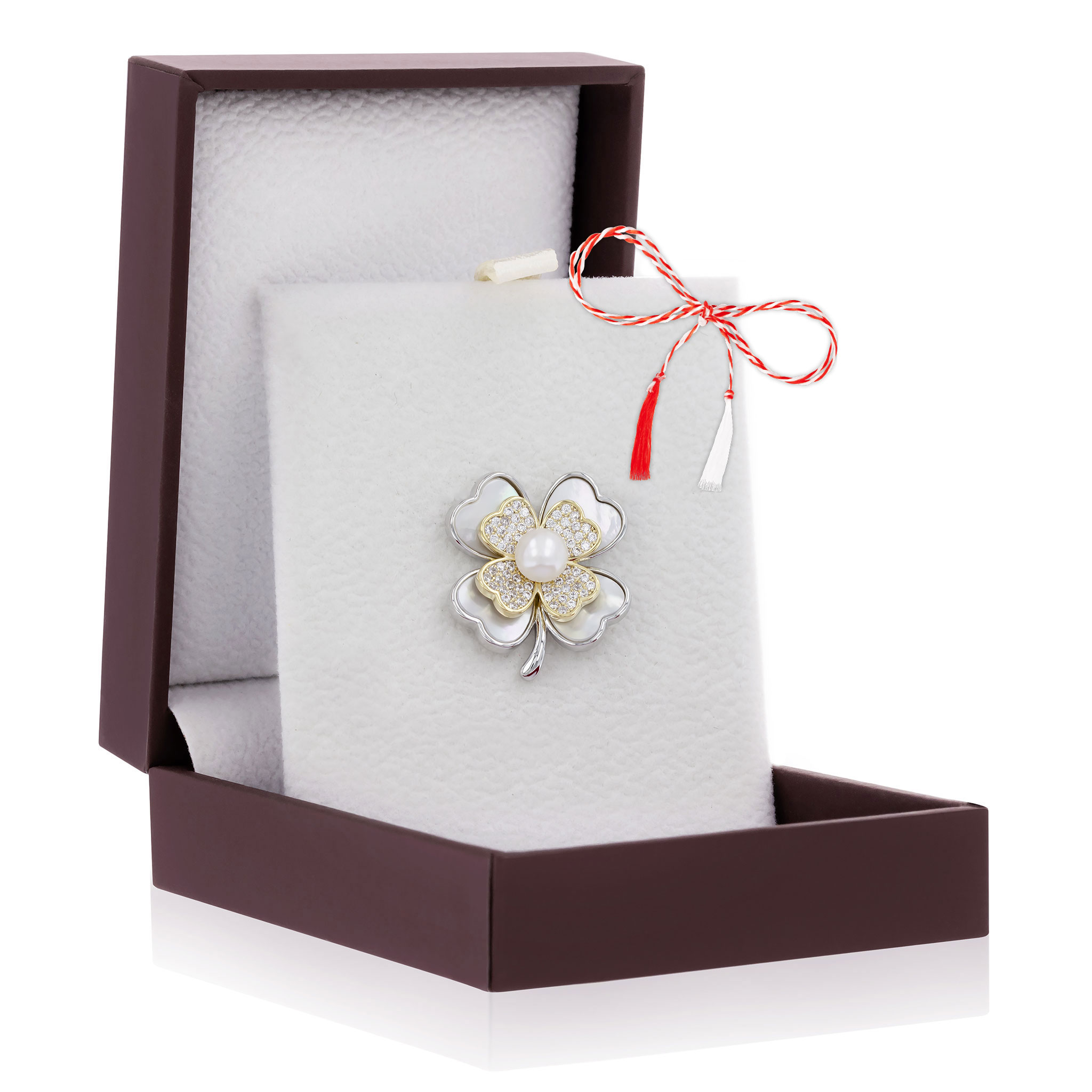 • Broșă Pin Premium Palladium White Trifoi cu Perlă, șnur Marțișor alb-roșu, ambalată pe suport pentru broșă și casetă,  însoțită de pungă cadou și plic roșu cu mesaj, pregătită cu grijă astfel încât să devină un cadou memorabil.