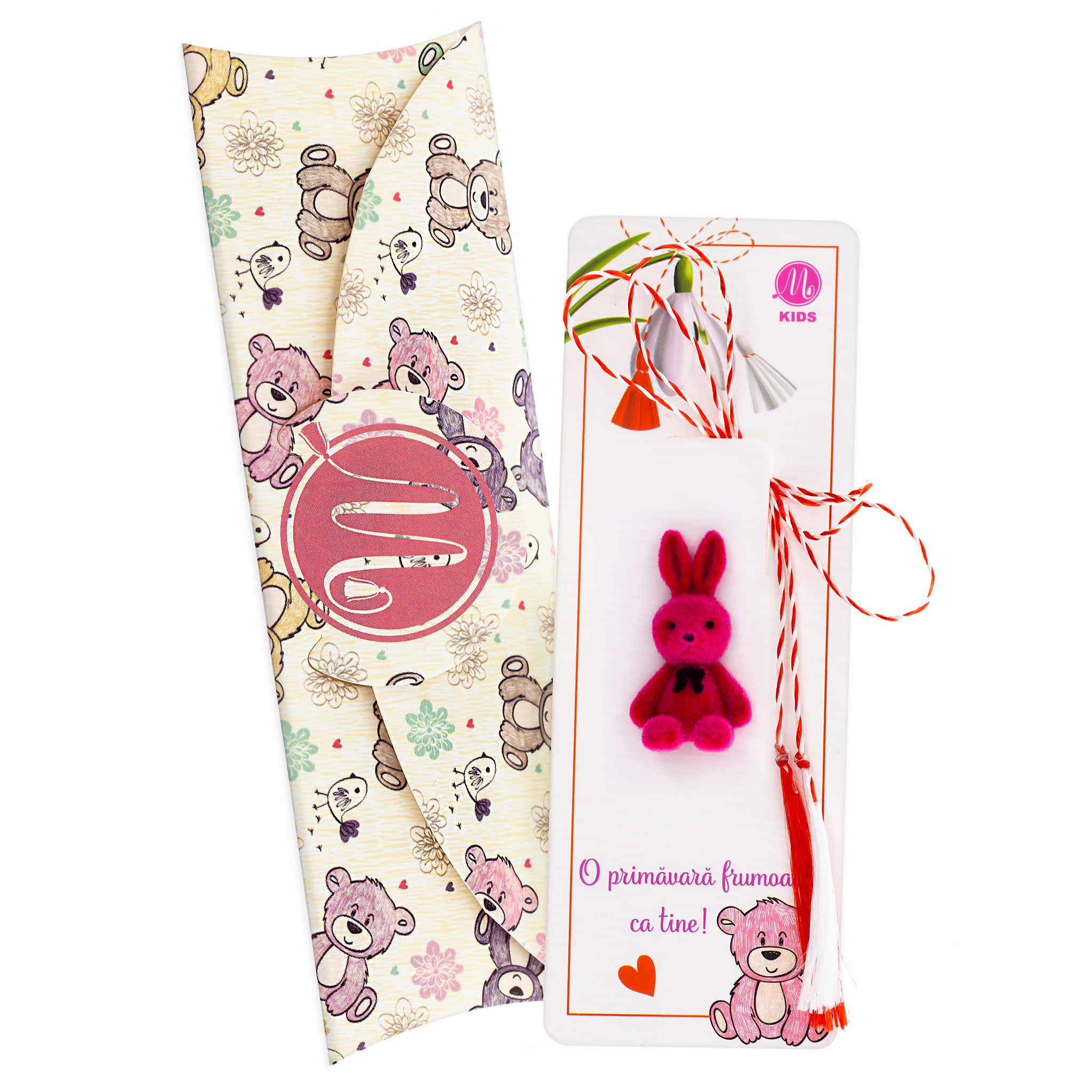 - Broșă Pin Sweety Copii – Iepuraș Fuchsia, șnur Marțișor alb-roșu, însoțită de suport pentru broșă și plic, pregătită să adauge un zâmbet fiecărei zile.