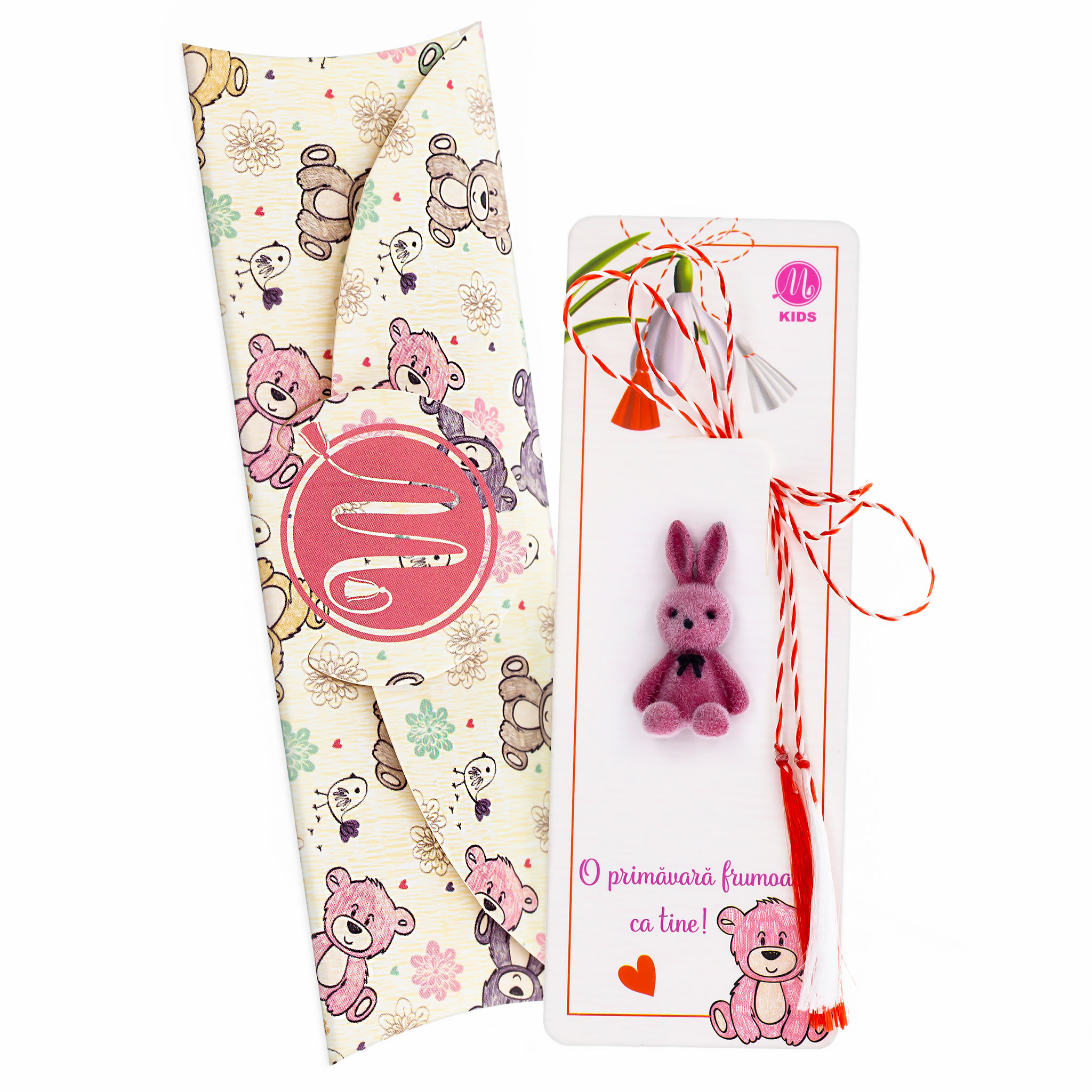 - Broșă Pin Sweety Copii – Iepuraș Roz, șnur Marțișor alb-roșu, însoțită de suport pentru broșă și plic, pregătită să adauge un zâmbet fiecărei zile.