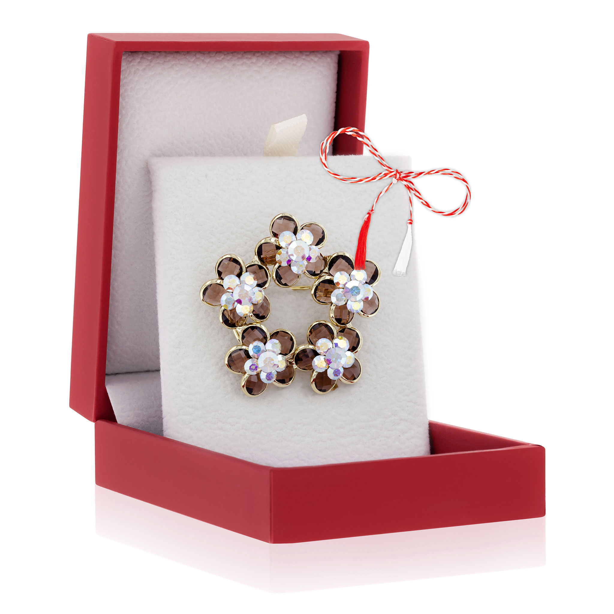 - Broșă Premium Gold Plated Coroniță cu Flori Roz, șnur Marțișor alb-roșu, ambalată pe suport pentru broșă și casetă, însoțită de pungă cadou și plic roșu pentru mesaj, pregătită cu grijă astfel încât să devină un cadou memorabil.