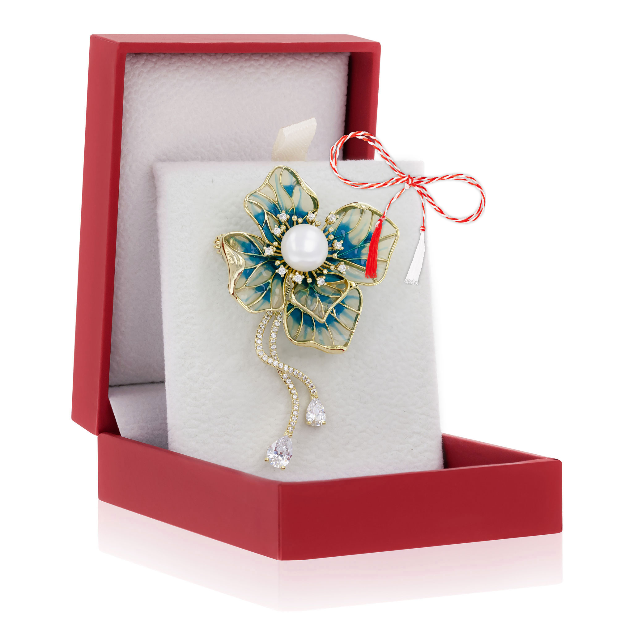 - Broșă Premium Gold Plated Floare Aurie cu Perlă, șnur Marțișor alb-roșu, ambalată pe suport pentru broșă și casetă, însoțită de pungă cadou și plic roșu pentru mesaj, pregătită cu grijă astfel încât să devină un cadou memorabil.