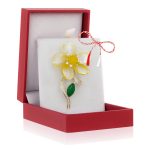 - Broșă PREMIUM Gold Plated – Floare cu Perlă Portocalie, șnur Marțișor alb-roșu, ambalată pe suport pentru broșă și casetă, pregătită cu grijă astfel încât să devină un cadou memorabil.