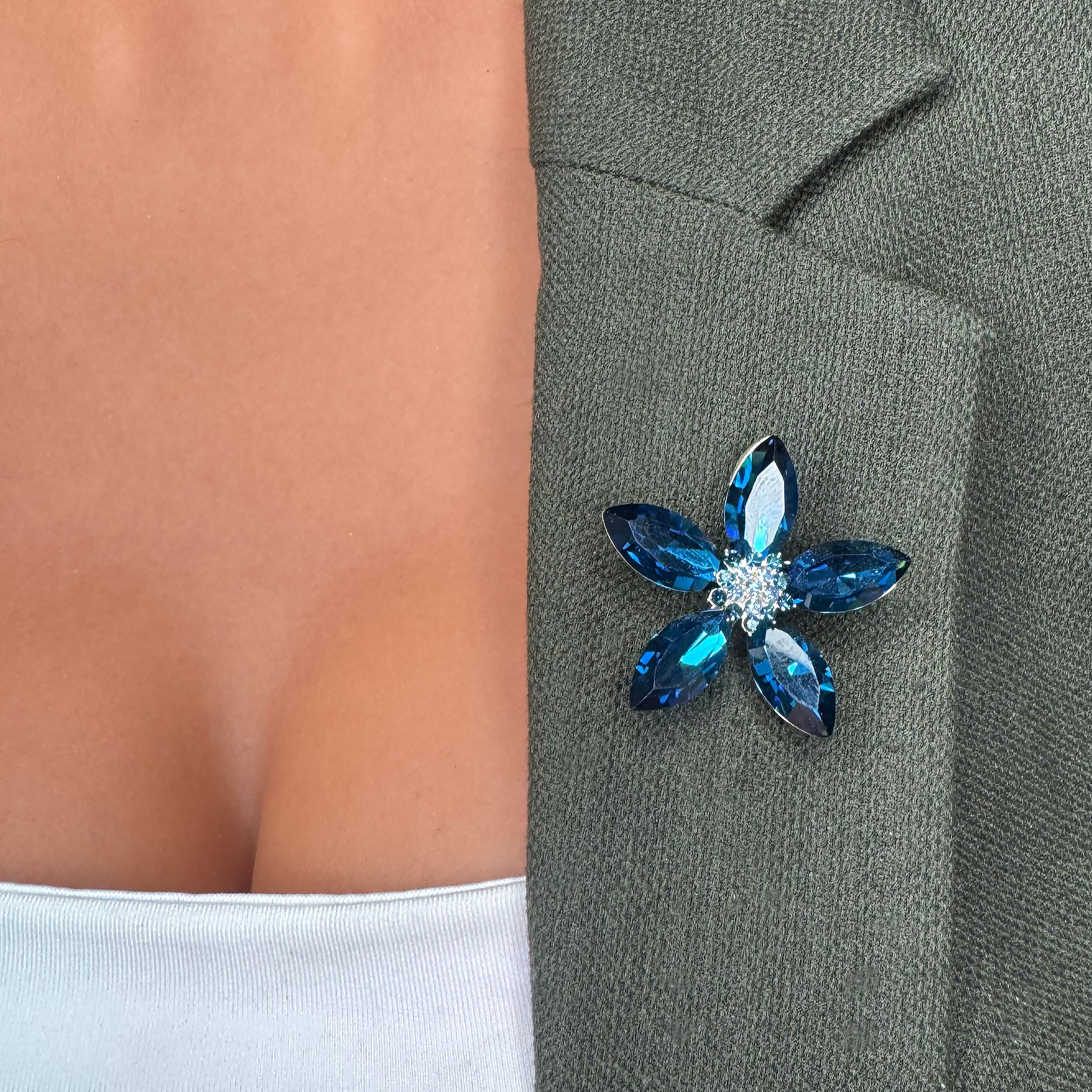 Broșa în formă de floare cu petale albastre este un accesoriu rafinat și plin de culoare, perfect pentru a adăuga un strop de eleganță și prospețime oricărei ținute. Petalele albastre, cu nuanțele lor vibrante, simbolizează pacea, serenitatea și frumusețea naturală.