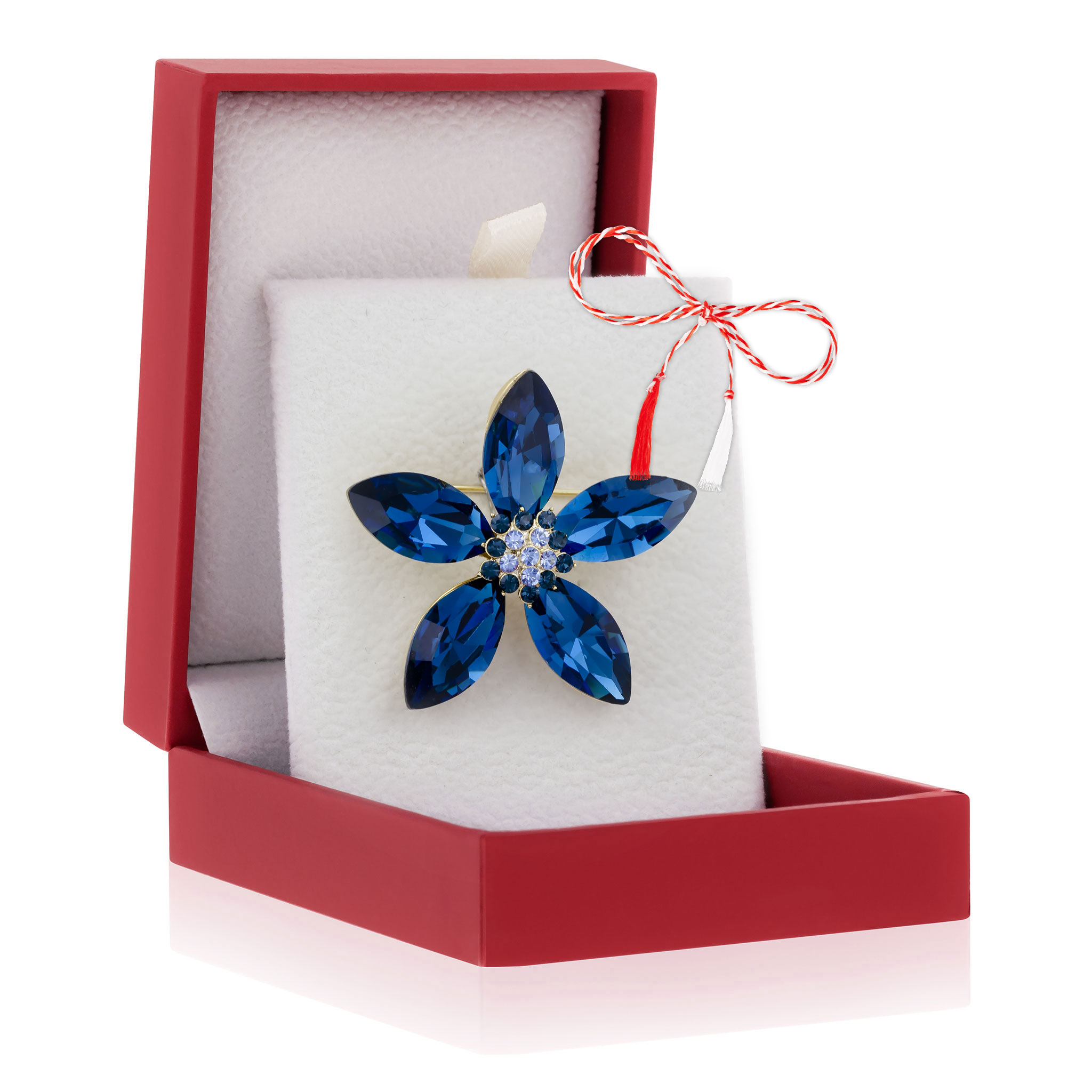 - Broșă Premium Gold Plated Floare cu Petale Albastre, șnur Marțișor alb-roșu, ambalată pe suport pentru broșă și casetă, însoțită de pungă cadou și plic roșu pentru mesaj, pregătită cu grijă astfel încât să devină un cadou memorabil.