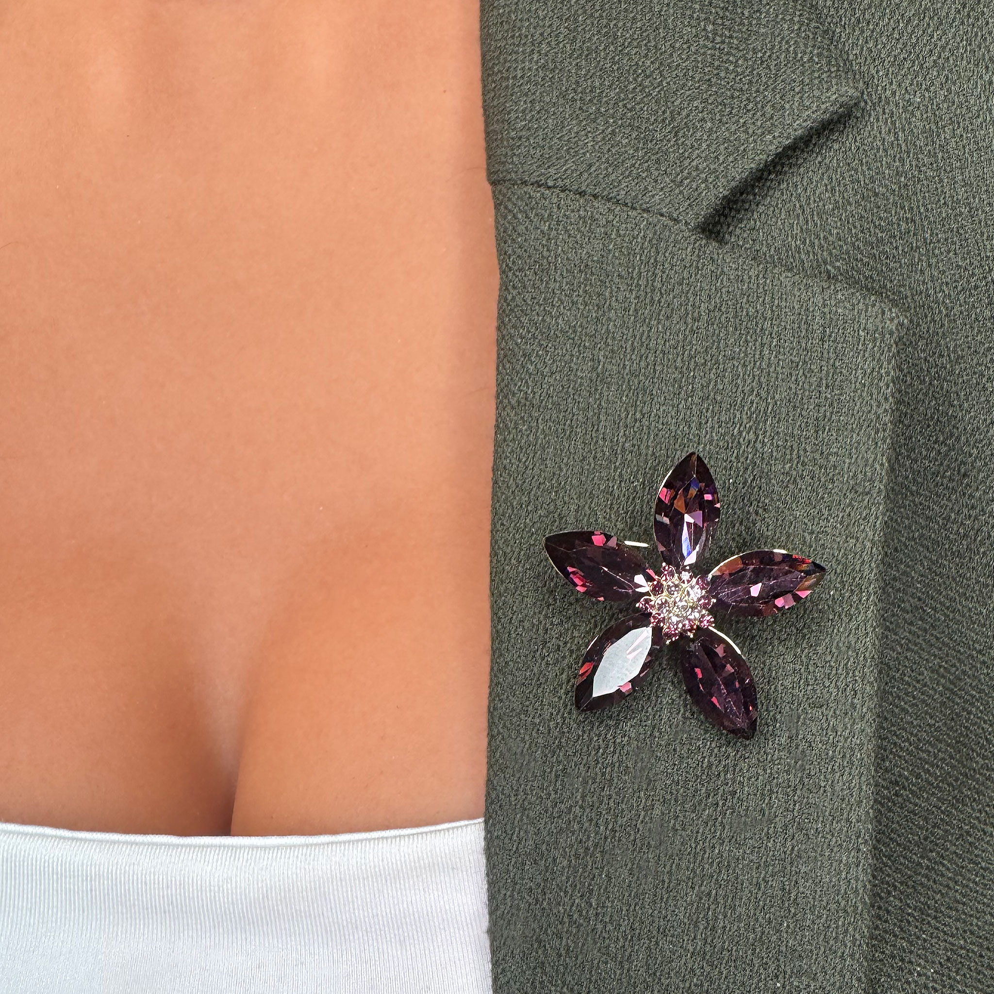 Această broșă în formă de floare cu petale roz este o bijuterie rafinată ce adaugă un strop de eleganță oricărei ținute. Designul floral sugerează feminitate și subtilitate, iar finisajul atent realizat subliniază frumusețea detaliilor.