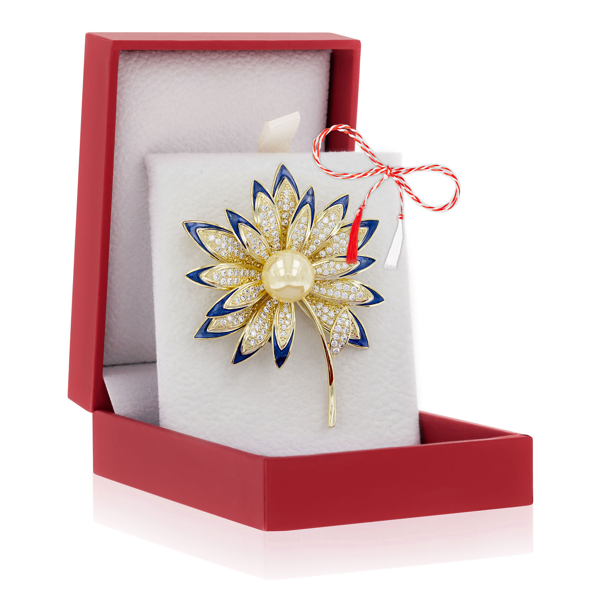 - Broșă Premium Gold Plated Floare Sidefată cu Perlă, șnur Marțișor alb-roșu, ambalată pe suport pentru broșă și casetă, însoțită de pungă cadou și plic roșu pentru mesaj, pregătită cu grijă astfel încât să devină un cadou memorabil.