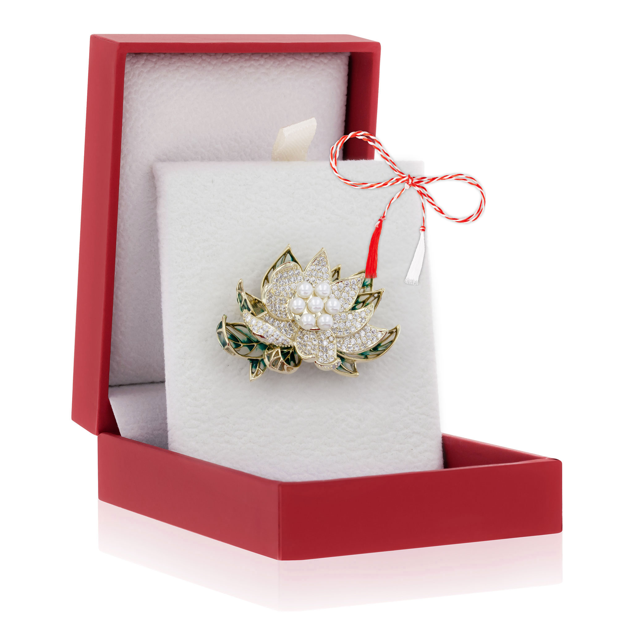 - Broșă Premium Gold Plated Floare Verde Stilizată, șnur Marțișor alb-roșu, ambalată pe suport pentru broșă și casetă, însoțită de pungă cadou și plic roșu pentru mesaj, pregătită cu grijă astfel încât să devină un cadou memorabil.