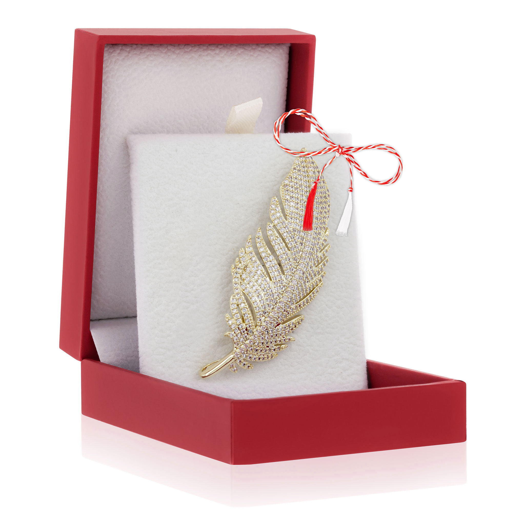 - Broșă Premium Gold Plated Frunză Aurie, șnur Marțișor alb-roșu, ambalată pe suport pentru broșă și casetă, însoțită de pungă cadou și plic roșu cu mesaj, pregătită cu grijă astfel încât să devină un cadou memorabil.
