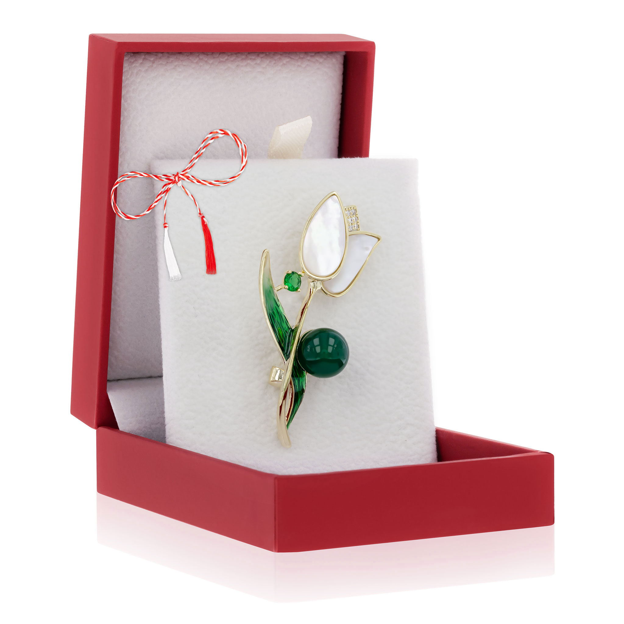 - Broșă Premium Gold Plated Lalea cu Sidef, șnur Marțișor alb-roșu, ambalată pe suport pentru broșă și casetă, însoțită de pungă cadou și plic roșu cu mesaj, pregătită cu grijă astfel încât să devină un cadou memorabil.
