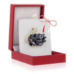 - Broșă Premium Gold Plated Lebadă Aurie cu Pietre Negre, șnur Marțișor alb-roșu, ambalată pe suport pentru broșă și casetă, însoțită de pungă cadou și plic roșu pentru mesaj, pregătită cu grijă astfel încât să devină un cadou memorabil.