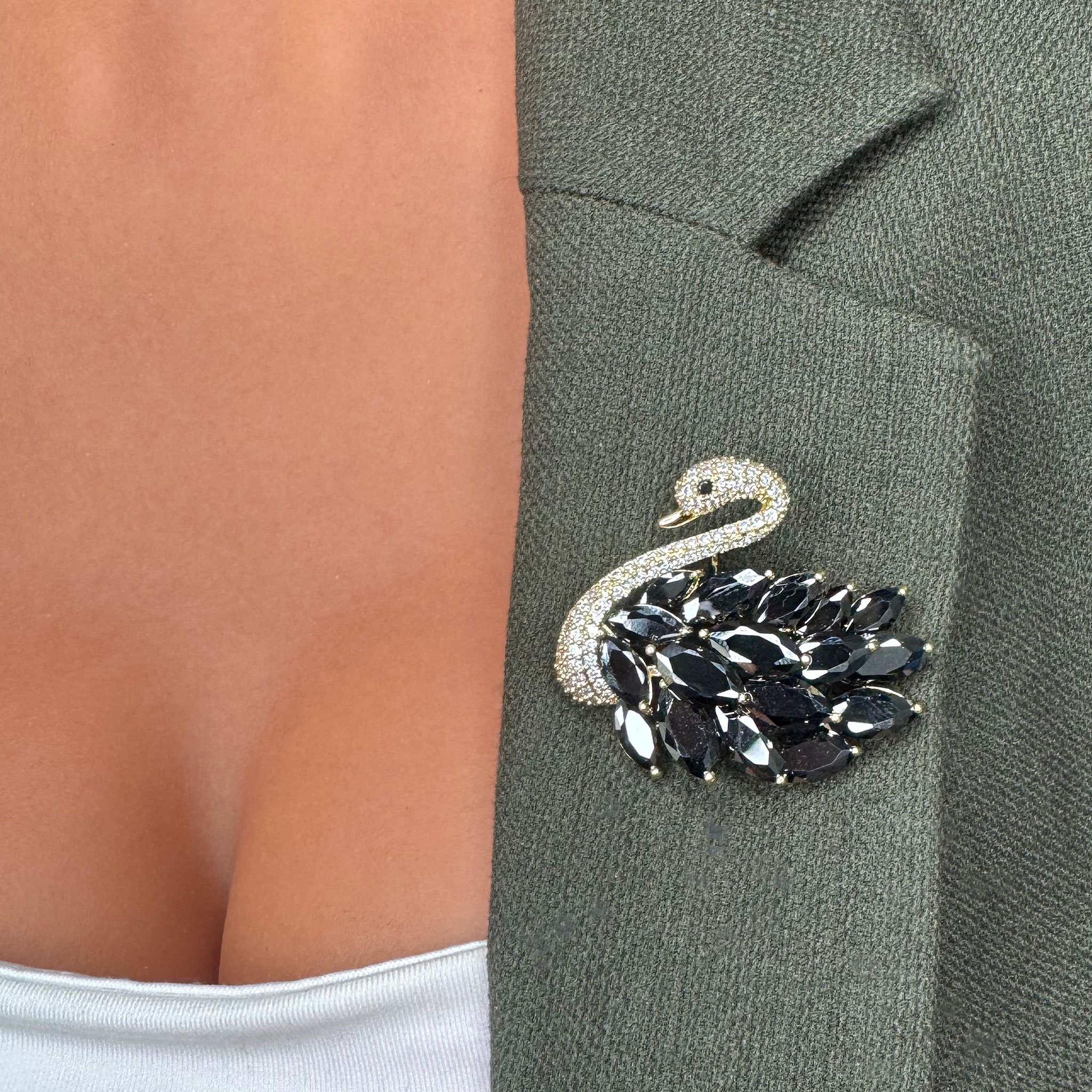 Această broșă în formă de lebădă cu pietre negre este o bijuterie elegantă ce îmbină frumusețea naturală cu un aer de mister. Designul său rafinat reflectă grația și delicatețea acestei păsări, în timp ce pietrele negre adaugă un contrast subtil și sofisticat, captând privirile.
