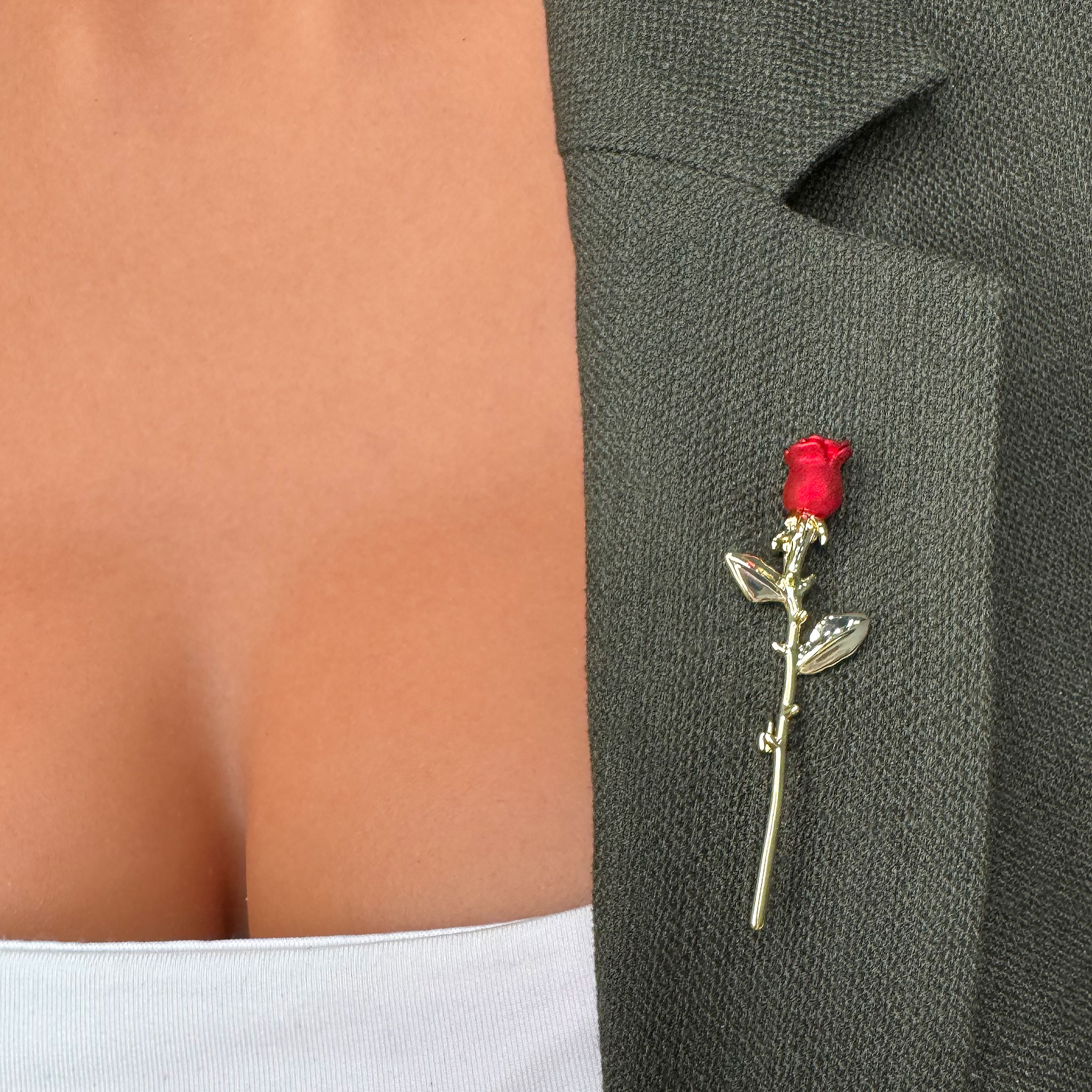 Broșa în formă de boboc de trandafir roșu aduce un accent delicat de pasiune și frumusețe, completând ținutele tale cu eleganță.