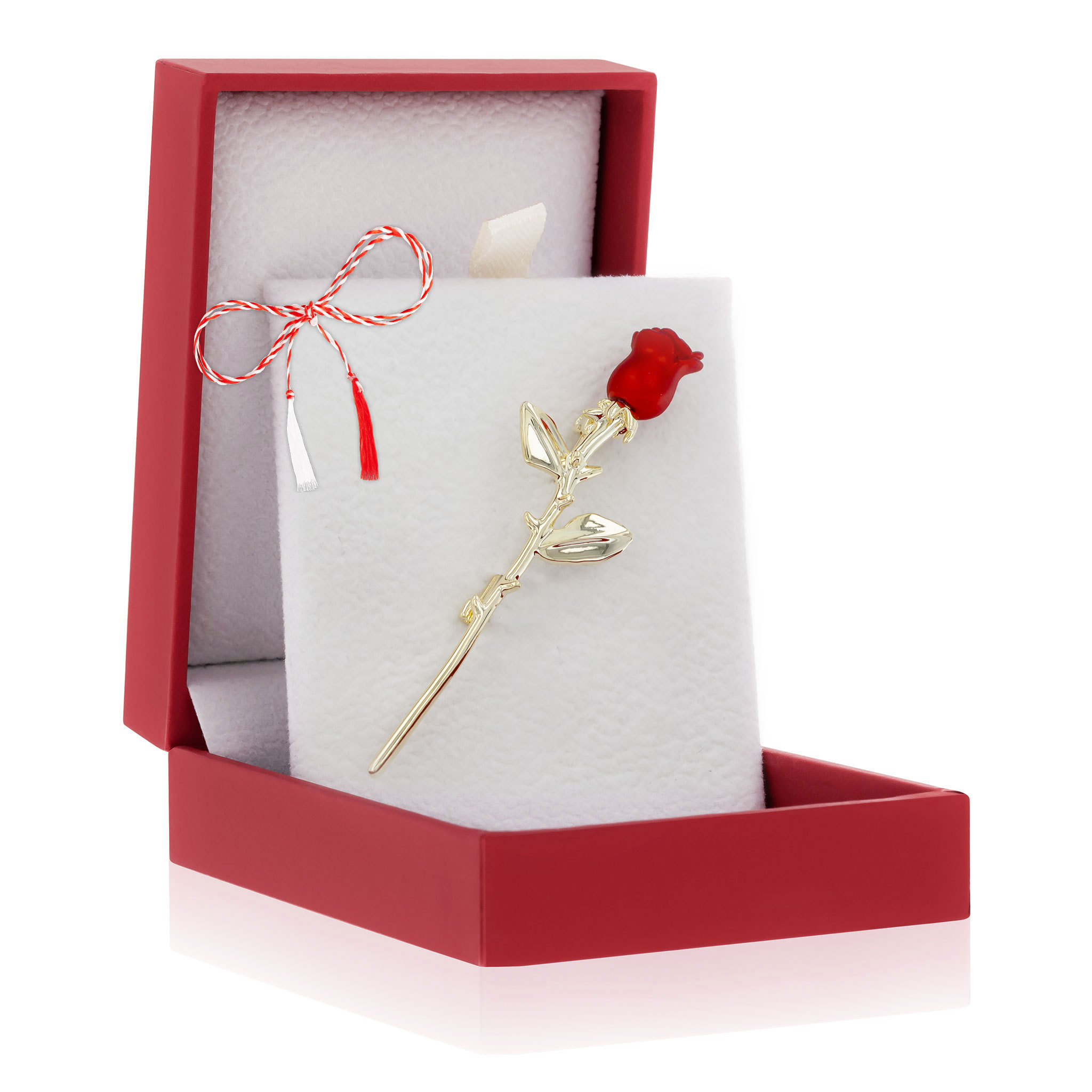 - Broșă PREMIUM Gold Plated – Model Boboc de Trandafir Roșu, șnur Marțișor alb-roșu, ambalată pe suport pentru broșă și casetă, pregătită cu grijă astfel încât să devină un cadou memorabil.