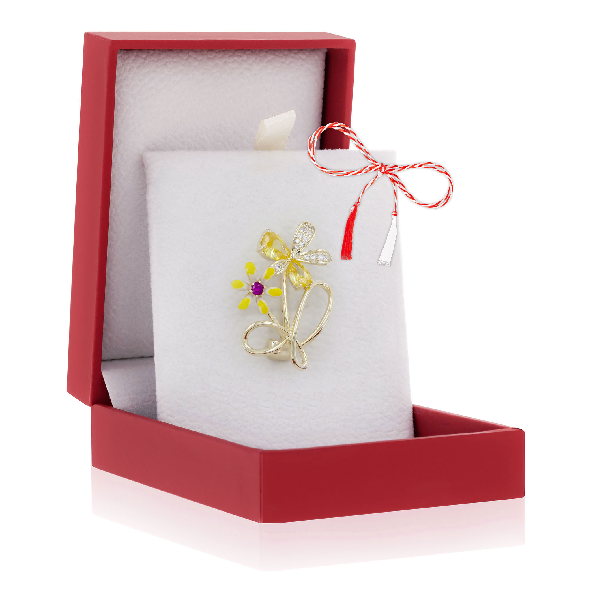 - Broșă PREMIUM Gold Plated – Model Buchețel cu Flori Galbene, șnur Marțișor alb-roșu, ambalată pe suport pentru broșă și casetă, pregătită cu grijă astfel încât să devină un cadou memorabil.