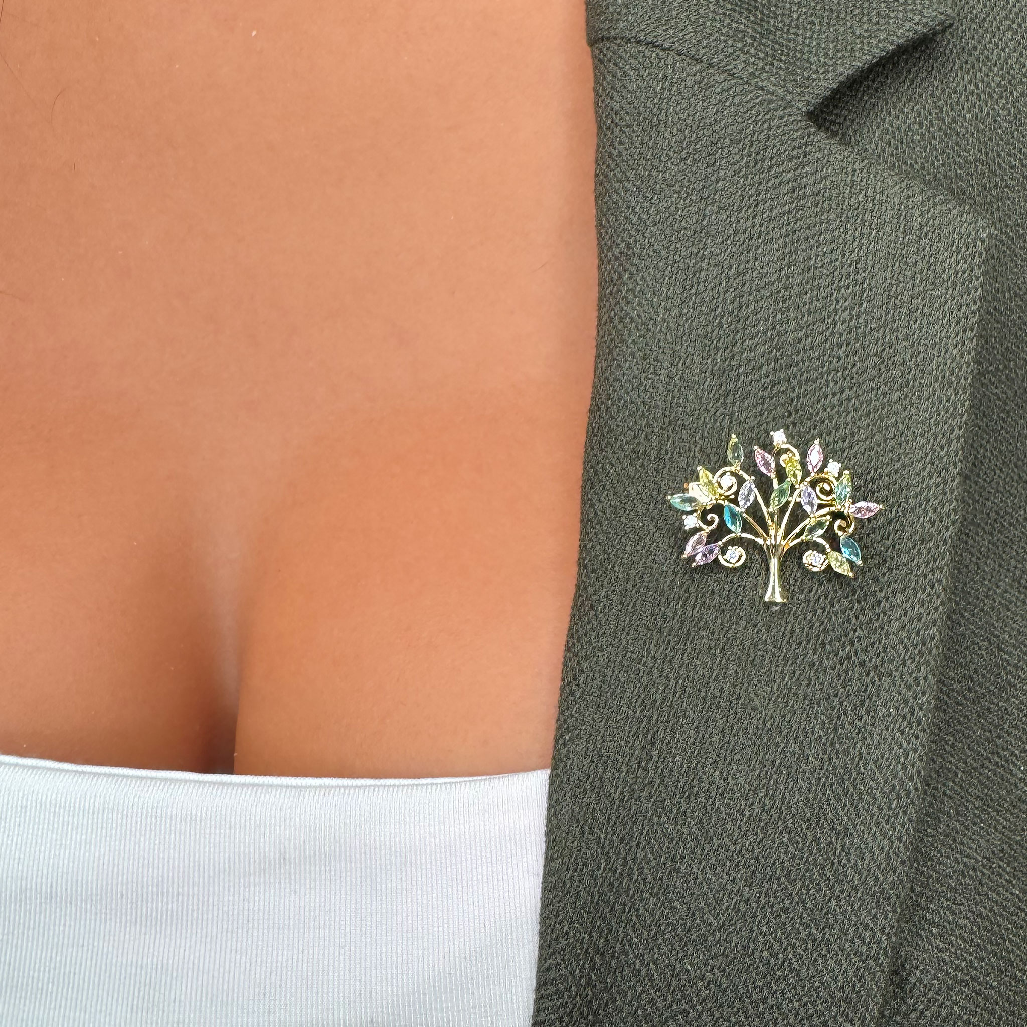 Broșa în formă de copac decorat cu pietre colorate adaugă prospețime, energie și un strop de eleganță ținutelor tale, fiind un accesoriu ideal pentru primăvară.