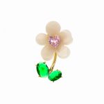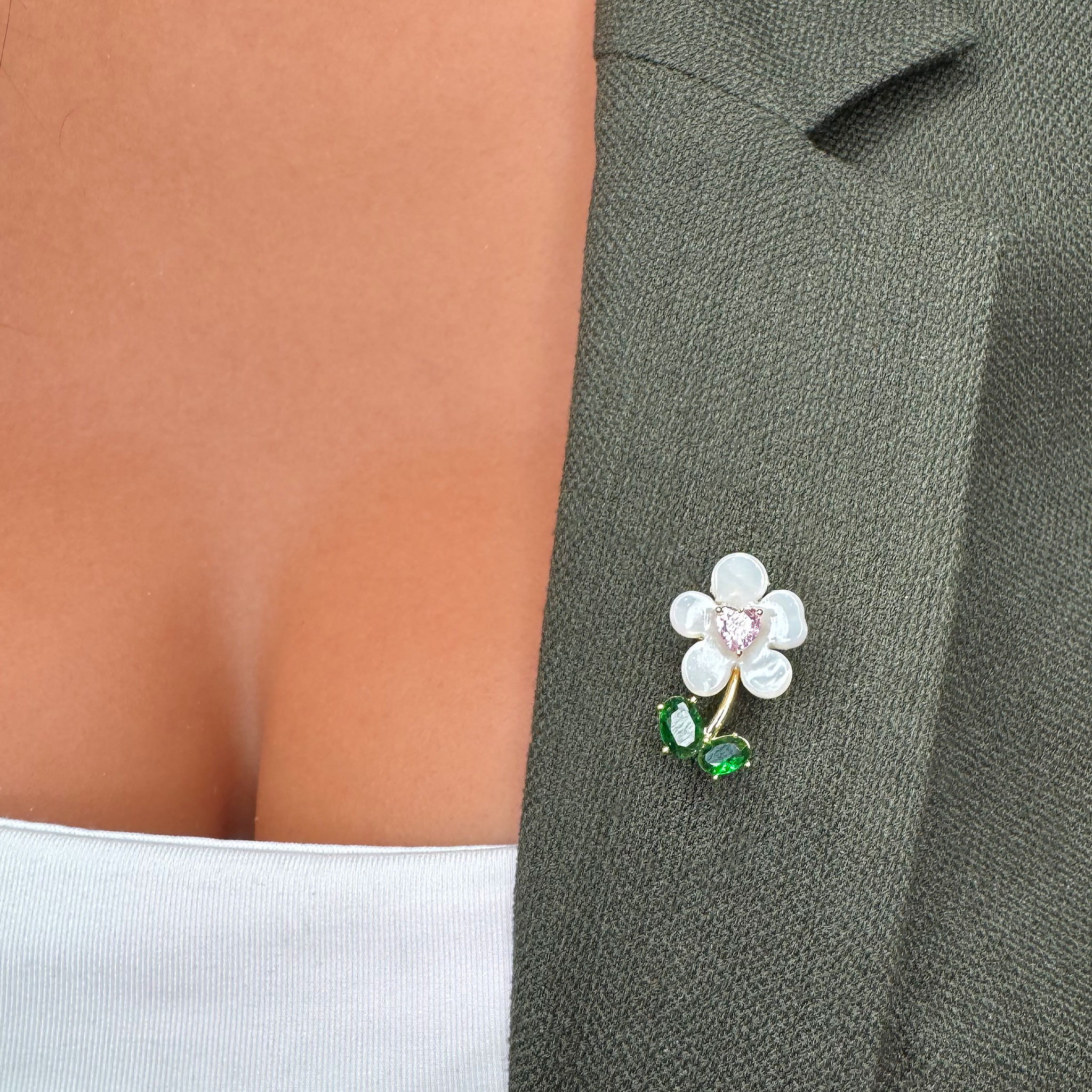 Această broșă delicată în formă de floare cu inimioară roz adaugă un strop de veselie și rafinament oricărei ținute.