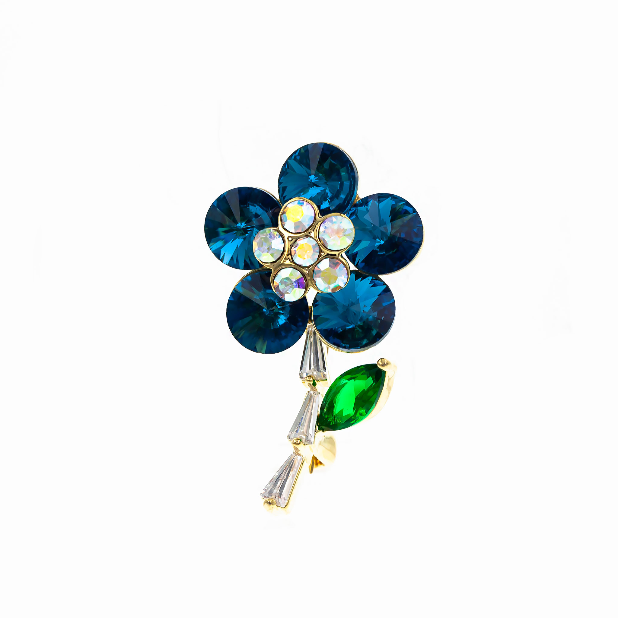 Această broșă în formă de floare cu petale albastre adaugă un strop de prospețime fiecărei ținute.