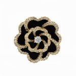 Această broșă delicată în formă de floare cu petale negre adaugă un strop de eleganță și rafinament oricărei ținute.
