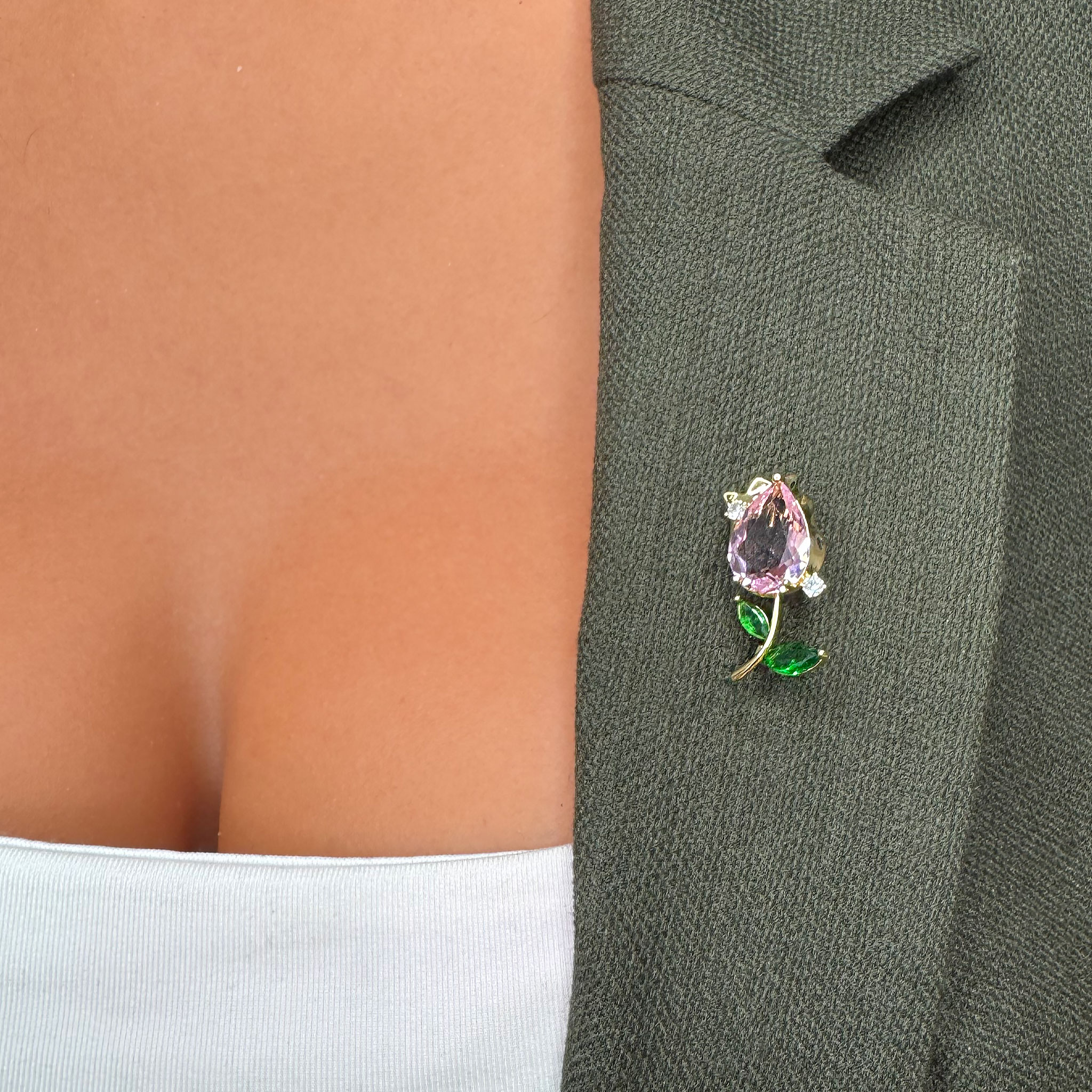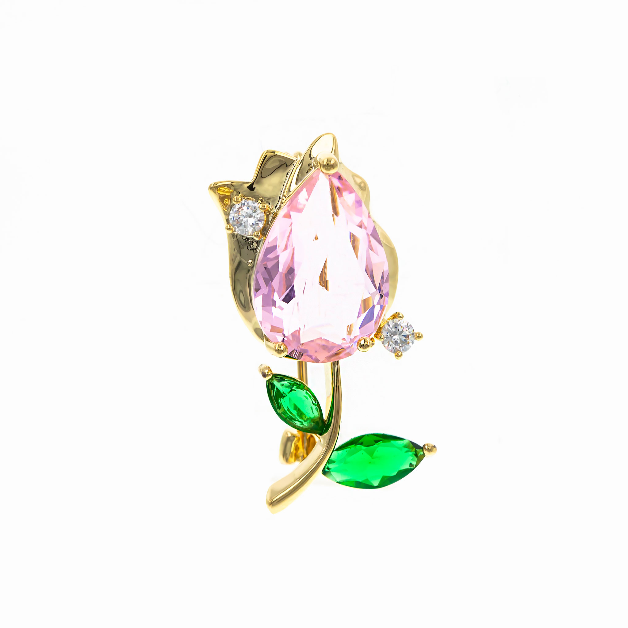 Această broșă în formă de lalea cu piatră roz este un accesoriu delicat și plin de farmec, perfect pentru a adăuga o notă de prospețime și eleganță ținutelor tale.