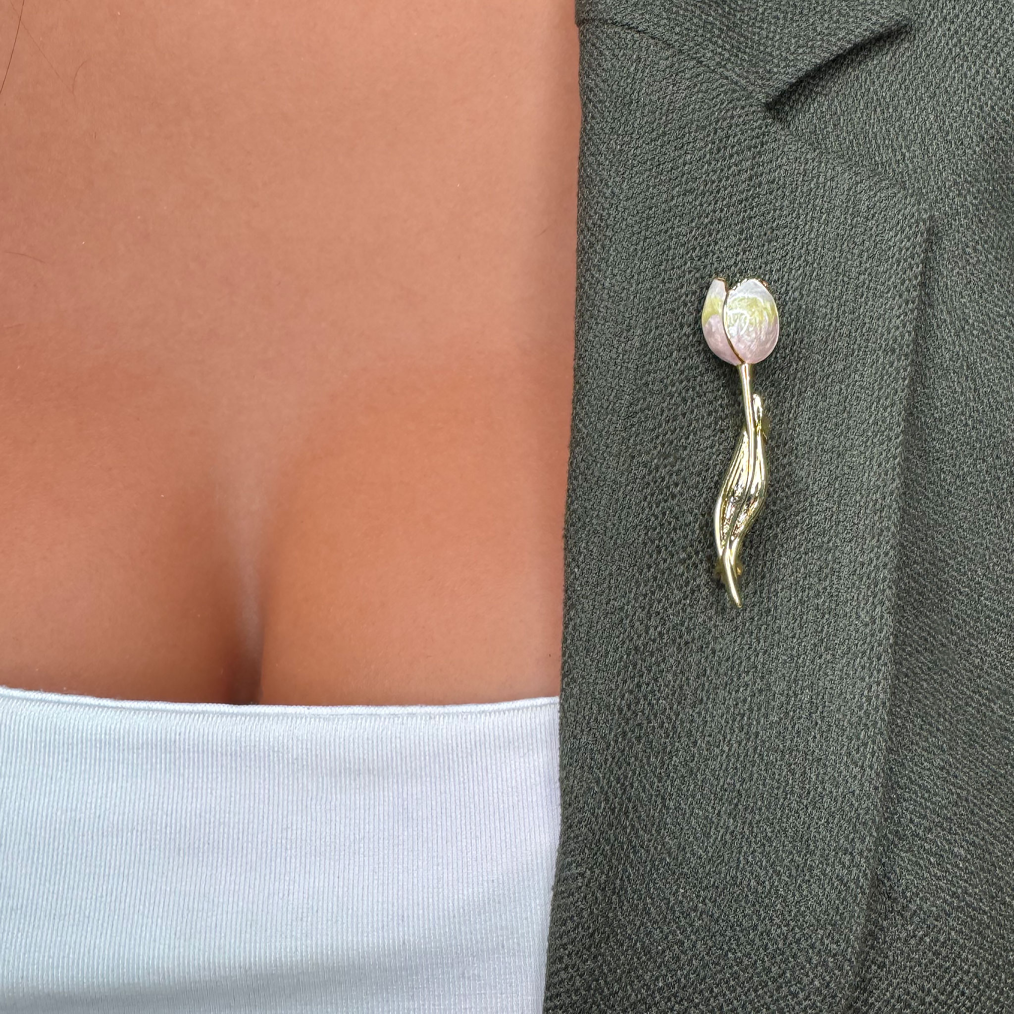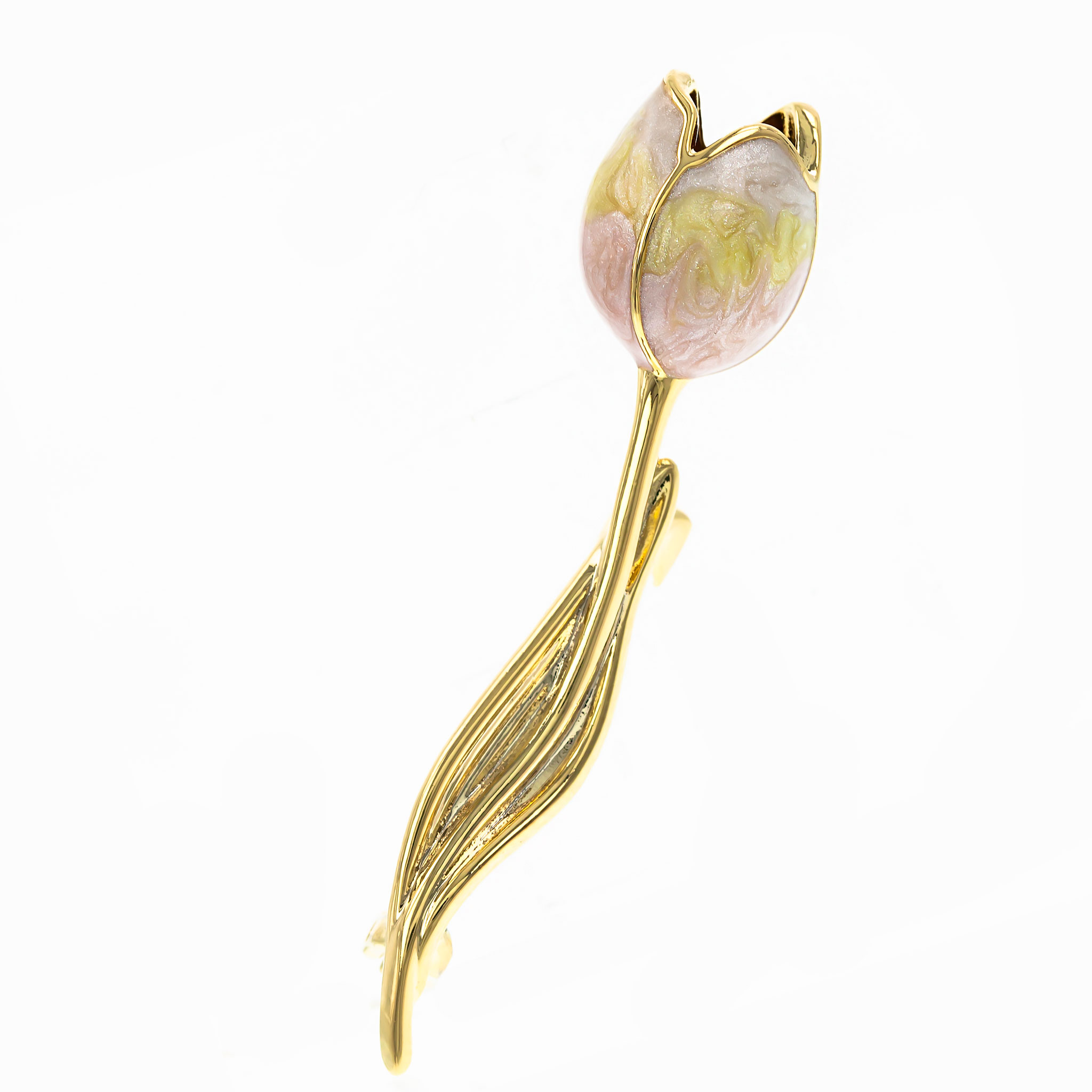 - Design Elegant: Forma delicată de lalea combinată cu culorile pastelale transformă broșa într-un punct de atracție ușor de asortat. Finisajul gold plated conferă broșei un aspect atrăgător.