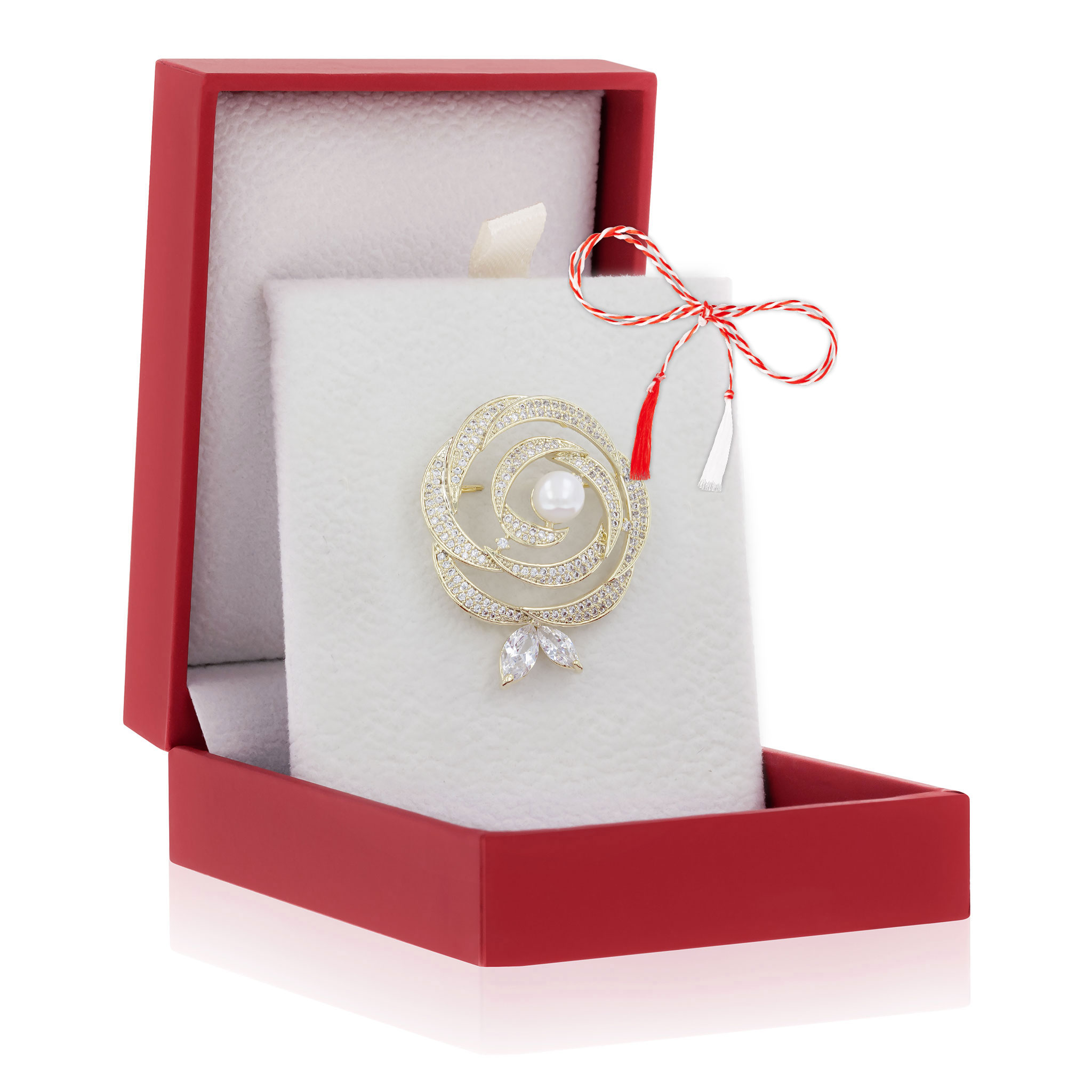 - Broșă PREMIUM Gold Plated – Model Trandafir cu Perlă, șnur Marțișor alb-roșu, ambalată pe suport pentru broșă și casetă, pregătită cu grijă astfel încât să devină un cadou memorabil.