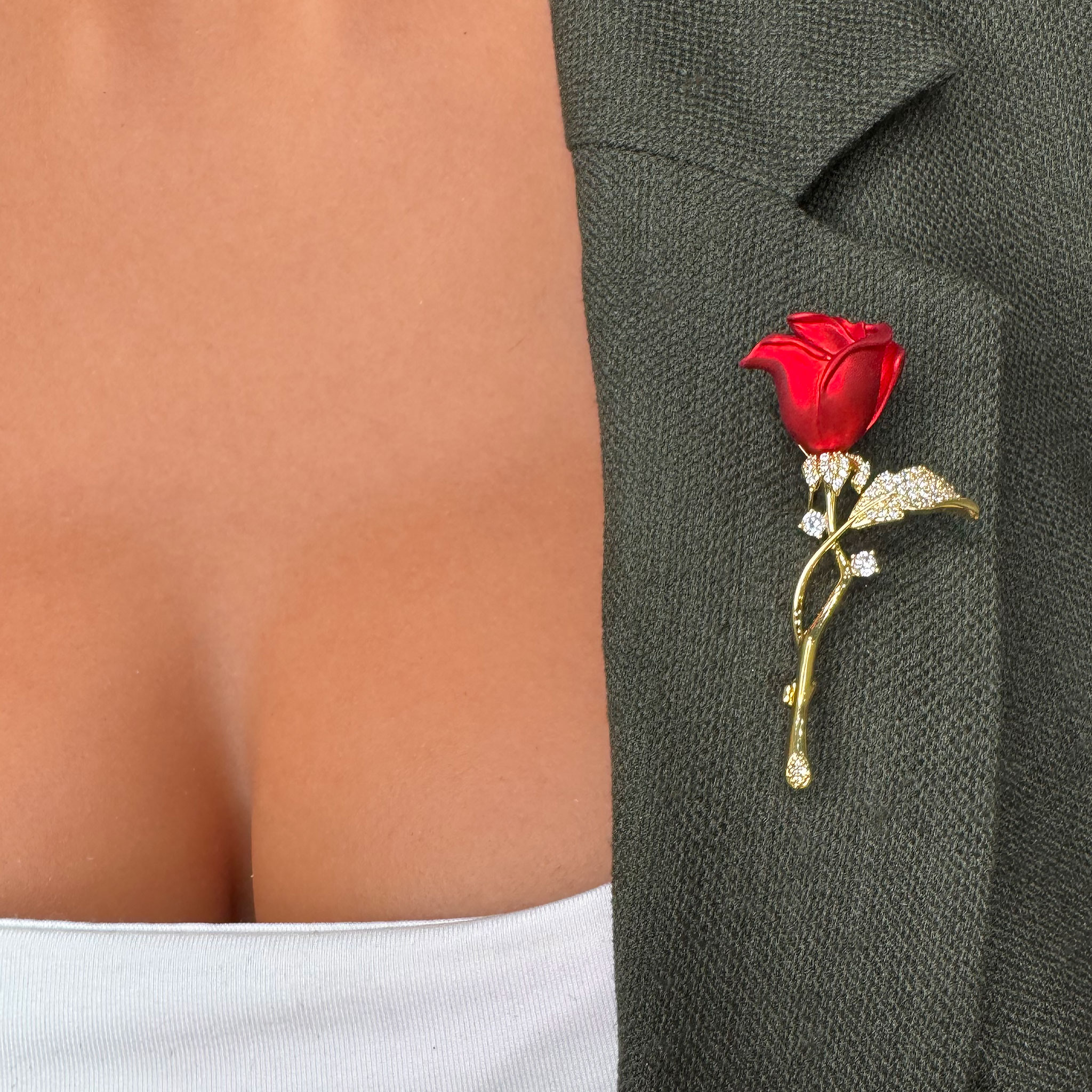 Broșa în formă de trandafir roșu cu pietricele adaugă eleganță, grație și un strop de romantism ținutelor tale, fiind un accesoriu perfect pentru primăvară.