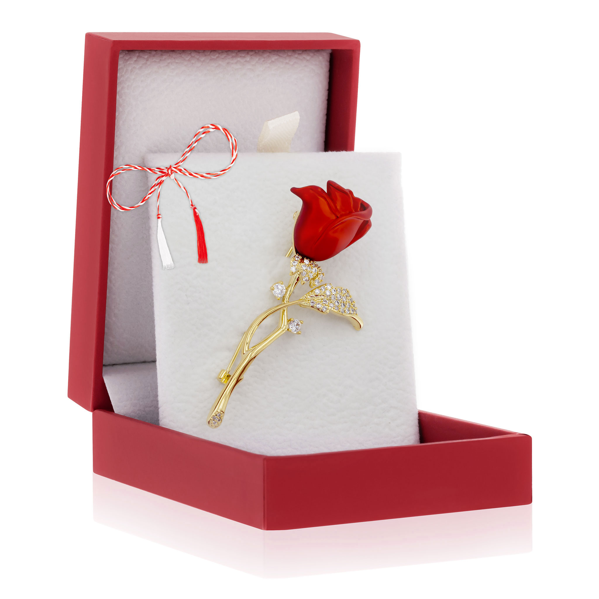 - Broșă PREMIUM Gold Plated – Model Trandafir Roșu cu Pietricele, șnur Marțișor alb-roșu, ambalată pe suport pentru broșă și casetă, pregătită cu grijă astfel încât să devină un cadou memorabil.